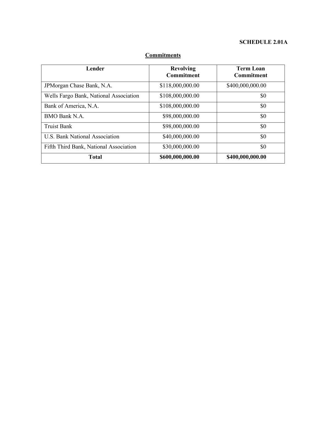 SCHEDULE 2.01A Commitments Lender Revolving Commitment Term Loan Commitment JPMorgan Chase Bank, N.A. $118,000,000.00 $400,000,000.00 Wells Fargo Bank, National Association $108,000,000.00 $0 Bank of America, N.A. $108,000,000.00 $0 BMO Bank N.A. $98,000,000.00 $0 Truist Bank $98,000,000.00 $0 U.S. Bank National Association $40,000,000.00 $0 Fifth Third Bank, National Association $30,000,000.00 $0 Total $600,000,000.00 $400,000,000.00
