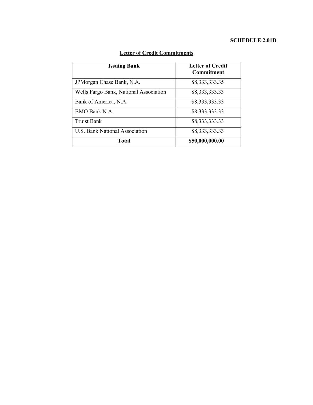 SCHEDULE 2.01B Letter of Credit Commitments Issuing Bank Letter of Credit Commitment JPMorgan Chase Bank, N.A. $8,333,333.35 Wells Fargo Bank, National Association $8,333,333.33 Bank of America, N.A. $8,333,333.33 BMO Bank N.A. $8,333,333.33 Truist Bank $8,333,333.33 U.S. Bank National Association $8,333,333.33 Total $50,000,000.00