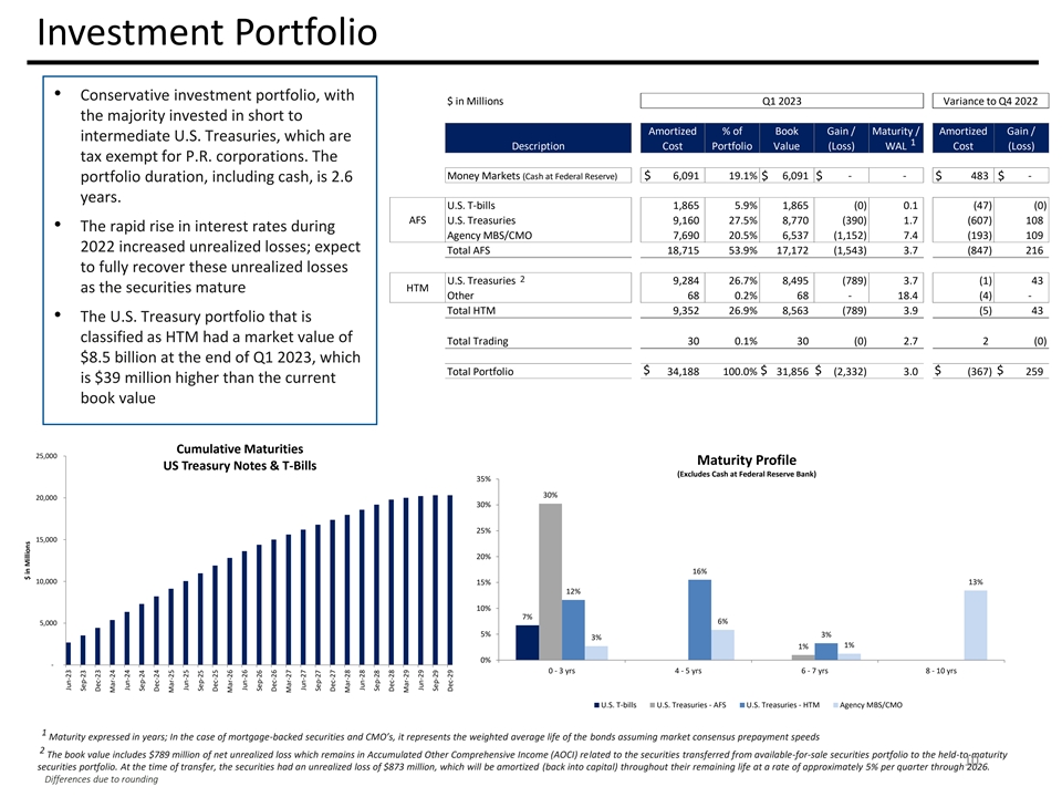 Investment Portfolio • Conservative investment portfolio, with $ in Millions Q1 2023 Variance to Q4 2022 Q4 2022 the majority invested in short to Amortized % of Book Gain / Maturity / Amortized Gain / intermediate U.S. Treasuries, which are 1 Description Cost Portfolio Value (Loss) WAL Cost (Loss) tax exempt for P.R. corporations. The Money Markets (Cash at Federal Reserve) $ 6,091 19.1% $ 6,091 $ - - $ 483 $ - portfolio duration, including cash, is 2.6 years. U.S. T-bills 1,865 5.9% 1,865 (0) 0.1 (47) (0) AFS U.S. Treasuries 9,160 27.5% 8,770 (390) 1.7 (607) 108 • The rapid rise in interest rates during Agency MBS/CMO 7,690 20.5% 6,537 (1,152) 7.4 (193) 109 2022 increased unrealized losses; expect Total AFS 18,715 53.9% 17,172 (1,543) 3.7 (847) 216 Earnings to fully recover these unrealized losses 2 U.S. Treasuries 9,284 26.7% 8,495 (789) 3.7 (1) 43 as the securities mature HTM Other 68 0.2% 68 - 18.4 1 (4 ) - Total HTM 9,352 26.9% 8,563 (789) 3.9 (5 ) 43 • The U.S. Treasury portfolio that is classified as HTM had a market value of Total Trading 30 0.1% 30 (0) 2.7 2 (0) $8.5 billion at the end of Q1 2023, which Total Portfolio $ 34,188 100.0% $ 31,856 $ (2,332) 3.0 $ (367) $ 259 is $39 million higher than the current book value Cumulative Maturities 25,000 Maturity Profile US Treasury Notes & T-Bills (Excludes Cash at Federal Reserve Bank) 35% 30% 20,000 30% 25% 15,000 20% 16% 10,000 13% 15% 12% 10% 7% 6% 5,000 5% 3% 3% 1% 1% 0% 0% 0% 0% 0% 0% 0% - 0 - 3 yrs 4 - 5 yrs 6 - 7 yrs 8 - 10 yrs U.S. T-bills U.S. Treasuries - AFS U.S. Treasuries - HTM Agency MBS/CMO 1 Maturity expressed in years; In the case of mortgage-backed securities and CMO’s, it represents the weighted average life of the bonds assuming market consensus prepayment speeds 2 The book value includes $789 million of net unrealized loss which remains in Accumulated Other Comprehensive Income (AOCI) related to the securities transferred from available-for-sale securities portfolio to the held-to-maturity 10 securities portfolio. At the time of transfer, the securities had an unrealized loss of $873 million, which will be amortized (back into capital) throughout their remaining life at a rate of approximately 5% per quarter through 2026. Differences due to rounding $ in Millions Jun-23 Sep-23 Dec-23 Mar-24 Jun-24 Sep-24 Dec-24 Mar-25 Jun-25 Sep-25 Dec-25 Mar-26 Jun-26 Sep-26 Dec-26 Mar-27 Jun-27 Sep-27 Dec-27 Mar-28 Jun-28 Sep-28 Dec-28 Mar-29 Jun-29 Sep-29 Dec-29