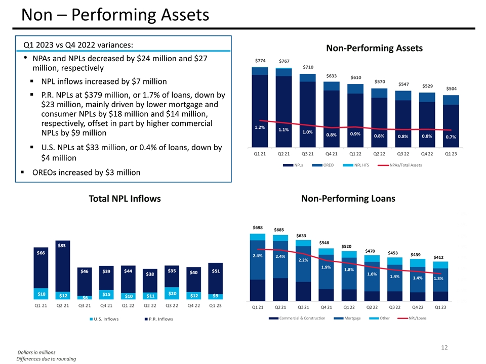Capital • Robust regulatory capital levels • Common Equity Tier 1 of 16.7% • Leverage ratio of 8.5% impacted by the high proportion of zero-risk weighted assets on the balance sheet, which represented 39% of total assets 1 • TCE ratio at 5.4% compared to 4.8% in Q4 2022; BPPR at 3.6% compared to 3.0% • Tangible book value per share increased by 11.5% to $50.15 compared to $44.97 in Q4 2022; primarily due to lower unrealized losses on debt securities and quarterly earnings Note: Current period ratios are estimated 11 1 TCE ratio is defined as the ratio of tangible common equity to tangible assets