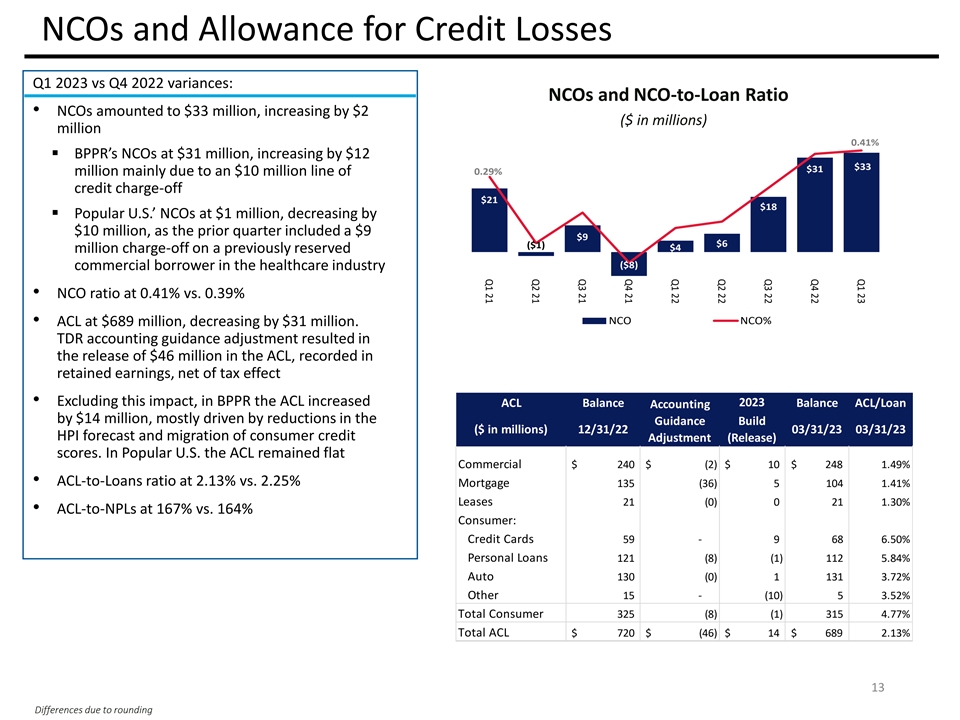 Non – Performing Assets Q1 2023 vs Q4 2022 variances: Non-Performing Assets • NPAs and NPLs decreased by $24 million and $27 million, respectively ▪ NPL inflows increased by $7 million ▪ P.R. NPLs at $379 million, or 1.7% of loans, down by $23 million, mainly driven by lower mortgage and consumer NPLs by $18 million and $14 million, respectively, offset in part by higher commercial NPLs by $9 million ▪ U.S. NPLs at $33 million, or 0.4% of loans, down by $4 million ▪ OREOs increased by $3 million Total NPL Inflows Non-Performing Loans 12 Dollars in millions Differences due to rounding