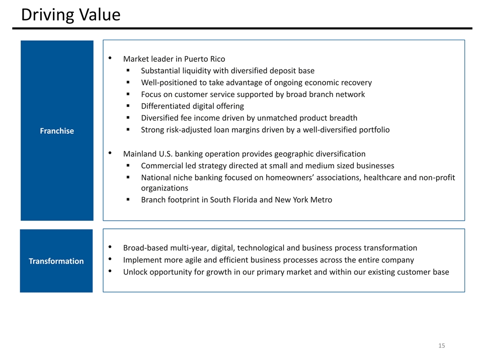 Driving Value • Market leader in Puerto Rico ▪ Substantial liquidity with diversified deposit base ▪ Well-positioned to take advantage of ongoing economic recovery ▪ Focus on customer service supported by broad branch network ▪ Differentiated digital offering ▪ Diversified fee income driven by unmatched product breadth ▪ Strong risk-adjusted loan margins driven by a well-diversified portfolio Franchise • Mainland U.S. banking operation provides geographic diversification ▪ Commercial led strategy directed at small and medium sized businesses ▪ National niche banking focused on homeowners’ associations, healthcare and non-profit organizations ▪ Branch footprint in South Florida and New York Metro • Broad-based multi-year, digital, technological and business process transformation • Implement more agile and efficient business processes across the entire company Transformation • Unlock opportunity for growth in our primary market and within our existing customer base 15