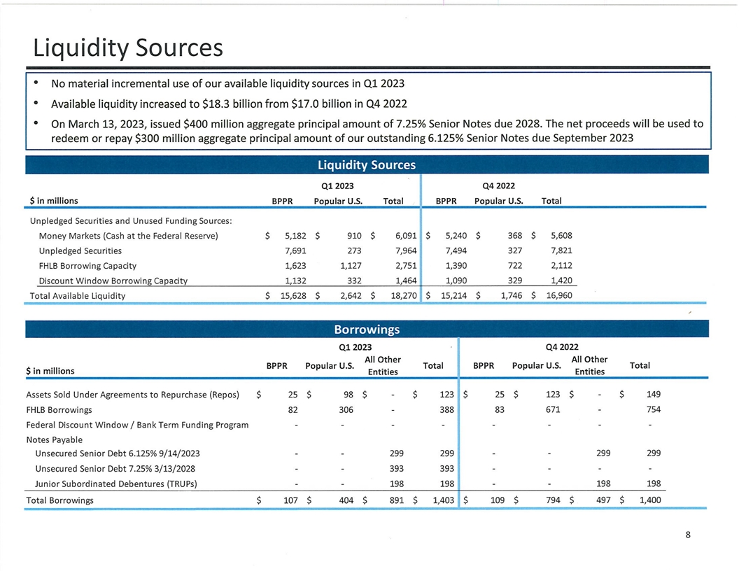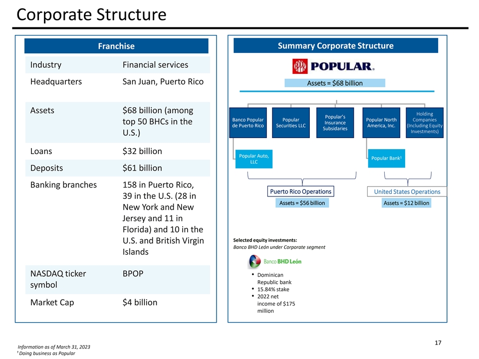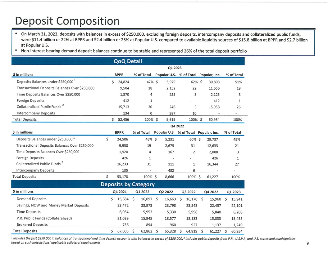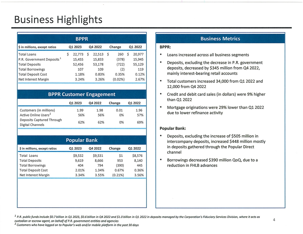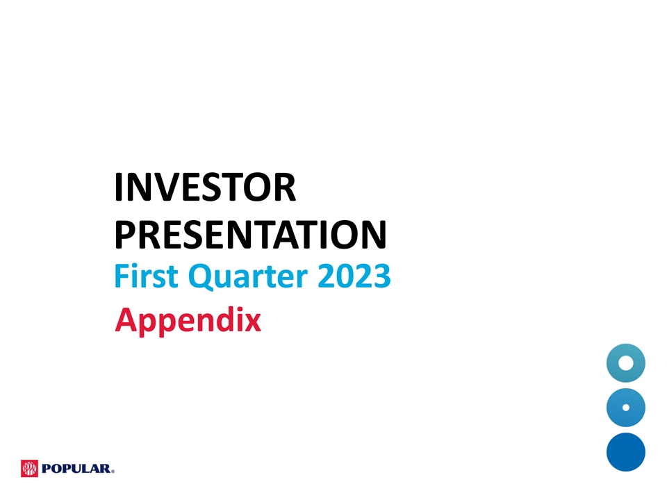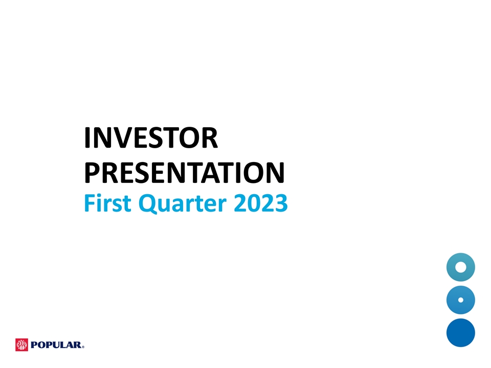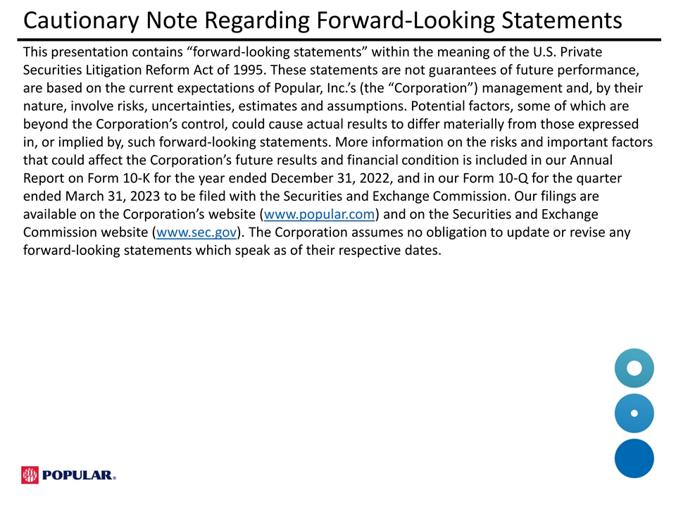 Cautionary Note Regarding Forward-Looking Statements This presentation contains “forward-looking statements” within the meaning of the U.S. Private Securities Litigation Reform Act of 1995. These statements are not guarantees of future performance, are based on the current expectations of Popular, Inc.’s (the “Corporation”) management and, by their nature, involve risks, uncertainties, estimates and assumptions. Potential factors, some of which are beyond the Corporation’s control, could cause actual results to differ materially from those expressed in, or implied by, such forward-looking statements. More information on the risks and important factors that could affect the Corporation’s future results and financial condition is included in our Annual Report on Form 10-K for the year ended December 31, 2022, and in our Form 10-Q for the quarter ended March 31, 2023 to be filed with the Securities and Exchange Commission. Our filings are available on the Corporation’s website (www.popular.com) and on the Securities and Exchange Commission website (www.sec.gov). The Corporation assumes no obligation to update or revise any forward-looking statements which speak as of their respective dates.