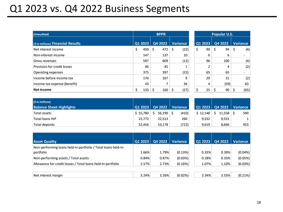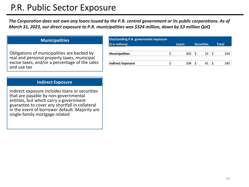 Q1 2023 vs. Q4 2022 Business Segments (Unaudited) BPPR Popular U.S. ($ in millions) Financial Results Q1 2023 Q4 2022 Variance Q1 2023 Q4 2022 Variance Net interest income $ 450 $ 472 $ (22) $ 90 $ 94 $ ( 4) Non-interest income 147 137 10 6 6 - Gross revenues 597 609 (12) 96 100 (4) Provision for credit losses 46 45 1 2 4 (2) Operating expenses 375 397 (22) 65 65 - Income before income tax 176 167 9 29 31 (2) Income tax expense (benefit) 43 7 36 4 (59) 63 Net income $ 133 $ 160 $ (27) $ 25 $ 90 $ ( 65) ($ in millions) Balance Sheet Highlights Q1 2023 Q4 2022 Variance Q1 2023 Q4 2022 Variance Total assets $ 55,780 $ 56,190 $ (410) $ 12,148 $ 1 1,558 $ 590 Total loans HIP 22,773 22,513 260 9,532 9,531 1 Total deposits 52,456 5 3,178 (722) 9,619 8,666 953 Asset Quality Q1 2023 Q4 2022 Variance Q1 2023 Q4 2022 Variance Non-performing loans held-in-portfolio / Total loans held-in- portfolio 1.66% 1.79% (0.13%) 0.35% 0.39% (0.04%) Non-performing assets / Total assets 0.84% 0.87% (0.03%) 0.28% 0.33% (0.05%) Allowance for credit losses / Total loans held-in-portfolio 2.57% 2.73% (0.16%) 1.07% 1.10% (0.03%) Net interest margin 3.24% 3.26% (0.02%) 3.34% 3.55% (0.21%) 18