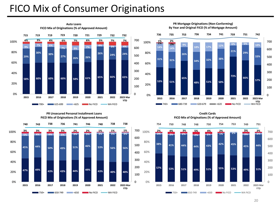 FICO Mix of Consumer Originations PR Mortgage Originations (Non-Conforming) Auto Loans By Year and Original FICO (% of Mortgage Amount) FICO Mix of Originations (% of Approved Amount) 736 735 736 734 741 759 751 742 753 715 719 719 723 720 721 729 732 732 4% 3% 6% 5% 700 4% 6% 7% 7% 7% 1% 2% 100% 700 100% 1% 5% 6% 2% 9% 10% 7% 6% 4% 12% 3% 4% 9% 17% 7% 14% 18% 7% 600 9% 14% 600 21% 80% 30% 29% 80% 26% 24% 30% 26% 24% 500 29% 27% 33% 500 26% 26% 31% 38% 32% 31% 34% 60% 400 60% 400 300 300 40% 40% 73% 66% 65% 65% 65% 66% 60% 60% 60% 61% 200 58% 58% 200 57% 53% 51% 51% 50% 48% 20% 20% 100 100 0% 0 0% 0 2015 2016 2017 2018 2019 2020 2021 2022 2023 Mar 2015 2016 2017 2018 2019 2020 2021 2022 2023 Mar YTD YTD 700+ 625-699 <625 No FICO WA FICO 740+ 680-739 620-679 <620 No FICO WA FICO PR Unsecured Personal Installment Loans Credit Cards FICO Mix of Originations (% of Approved Amount) FICO Mix of Originations (% of Approved Amount) 738 736 738 738 740 743 741 746 740 754 750 750 754 753 749 751 748 748 1% 700 3% 3% 3% 3% 3% 2% 2% 1% 1% 2% 4% 5% 4% 2% 3% 2% 100% 100% 700 2% 3% 3% 3% 3% 3% 3% 3% 2% 1% 4% 4% 2% 2% 3% 5% 5% 2% 600 600 80% 80% 38% 42% 45% 500 41% 44% 43% 44% 46% 500 44% 44% 45% 45% 51% 53% 50% 56% 56% 49% 60% 60% 400 400 300 300 40% 40% 200 57% 200 55% 53% 53% 51% 51% 51% 49% 49% 49% 49% 47% 44% 43% 43% 43% 20% 40% 40% 20% 100 100 0% 0 0% 0 2015 2016 2017 2018 2019 2020 2021 2022 2023 Mar 2015 2016 2017 2018 2019 2020 2021 2022 2023 Mar YTD YTD 750+ 650-749 <650 No FICO WA FICO 750+ 650-749 <650 No FICO WA FICO 20