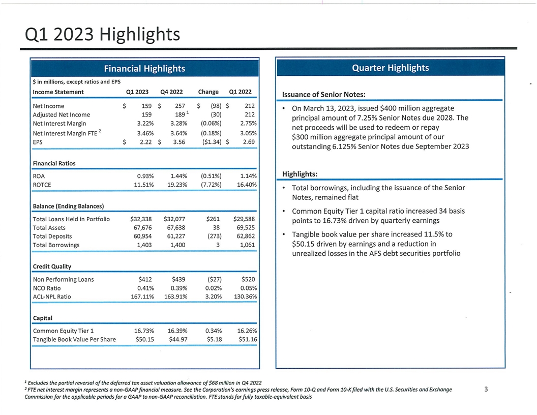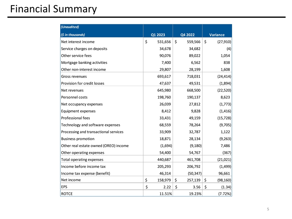 Financial Summary (Unaudited) ($ in thousands) Q1 2023 Q4 2022 Variance Net interest income $ 531,656 $ 559,566 $ (27,910) Service charges on deposits 34,678 34,682 (4) Other service fees 90,076 8 9,022 1,054 Mortgage banking activities 7 ,400 6,562 838 Other non-interest income 29,807 28,199 1,608 Gross revenues 693,617 718,031 (24,414) Provision for credit losses 47,637 49,531 (1,894) Net revenues 645,980 668,500 (22,520) Personnel costs 198,760 190,137 8,623 Net occupancy expenses 26,039 27,812 (1,773) Equipment expenses 8,412 9,828 (1,416) Professional fees 33,431 49,159 (15,728) Technology and software expenses 68,559 78,264 (9,705) Processing and transactional services 33,909 32,787 1,122 Business promotion 18,871 28,134 (9,263) Other real estate owned (OREO) income (1,694) (9,180) 7,486 Other operating expenses 54,400 54,767 (367) Total operating expenses 440,687 461,708 (21,021) Income before income tax 205,293 206,792 (1,499) Income tax expense (benefit) 46,314 (50,347) 96,661 Net income $ 158,979 $ 2 57,139 $ ( 98,160) EPS $ 2.22 $ 3.56 $ ( 1.34) ROTCE 11.51% 19.23% (7.72%) 5
