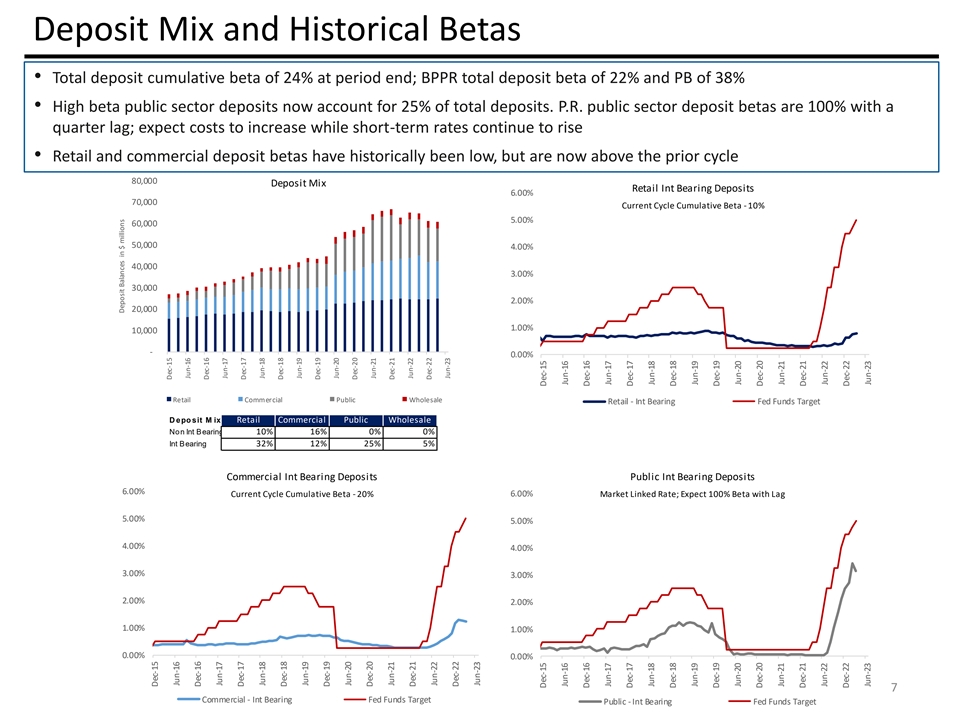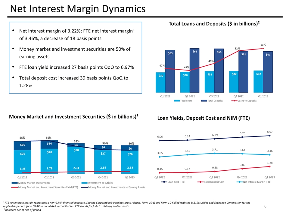 Net Interest Margin Dynamics Total Loans and Deposits ($ in billions)² 1 • Net interest margin of 3.22%; FTE net interest margin of 3.46%, a decrease of 18 basis points • Money market and investment securities are 50% of earning assets • FTE loan yield increased 27 basis points QoQ to 6.97% • Total deposit cost increased 39 basis points QoQ to 1.28% Money Market and Investment Securities ($ in billions)² Loan Yields, Deposit Cost and NIM (FTE) ¹ FTE net interest margin represents a non-GAAP financial measure. See the Corporation's earnings press release, Form 10-Q and Form 10-K filed with the U.S. Securities and Exchange Commission for the applicable periods for a GAAP to non-GAAP reconciliation. FTE stands for fully taxable-equivalent basis 6 2 Balances are of end of period