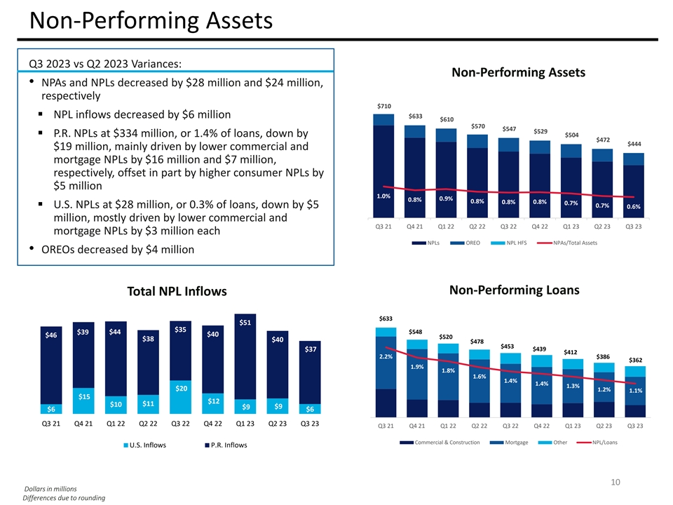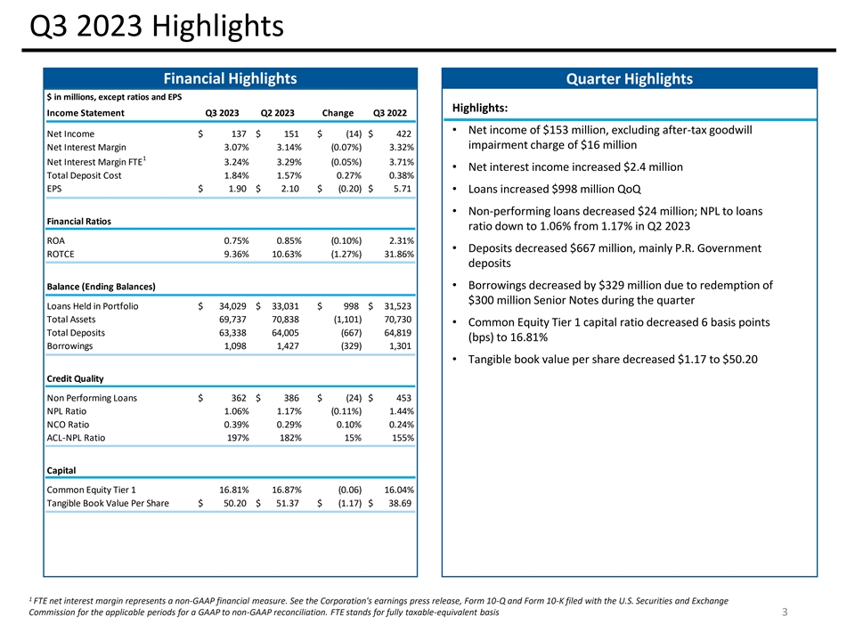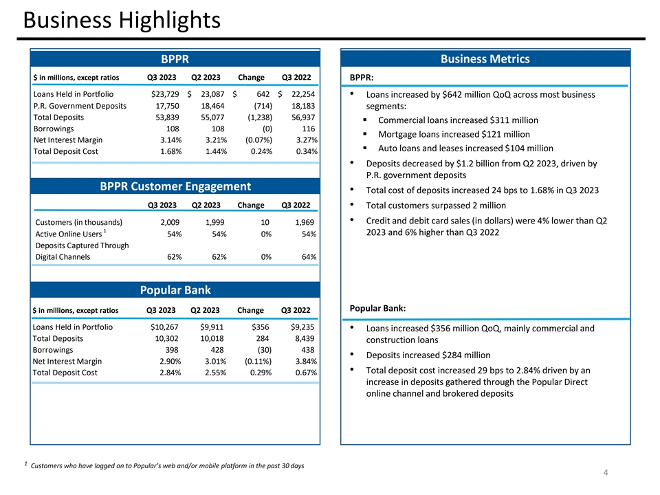 Q3 2023 Highlights Financial Highlights Quarter Highlights $ in millions, except ratios and EPS Highlights: Income Statement Q3 2023 Q2 2023 Change Q3 2022 • Net income of $153 million, excluding after-tax goodwill Net Income $ 137 $ 151 $ (14) $ 422 impairment charge of $16 million Net Interest Margin 3.07% 3.14% (0.07%) 3.32% 1 Net Interest Margin FTE 3.24% 3.29% (0.05%) 3.71% • Net interest income increased $2.4 million Total Deposit Cost 1.84% 1.57% 0.27% 0.38% EPS $ 1.90 $ 2.10 $ (0.20) $ 5.71 • Loans increased $998 million QoQ • Non-performing loans decreased $24 million; NPL to loans Financial Ratios ratio down to 1.06% from 1.17% in Q2 2023 ROA 0.75% 0.85% (0.10%) 2.31% • Deposits decreased $667 million, mainly P.R. Government ROTCE 9.36% 10.63% (1.27%) 31.86% deposits Balance (Ending Balances)• Borrowings decreased by $329 million due to redemption of $300 million Senior Notes during the quarter Loans Held in Portfolio $ 34,029 $ 33,031 $ 998 $ 31,523 Total Assets 69,737 70,838 (1,101) 70,730 • Common Equity Tier 1 capital ratio decreased 6 basis points Total Deposits 63,338 64,005 (667) 64,819 (bps) to 16.81% Borrowings 1,098 1,427 (329) 1,301 • Tangible book value per share decreased $1.17 to $50.20 Credit Quality Non Performing Loans $ 362 $ 386 $ (24) $ 453 NPL Ratio 1.06% 1.17% (0.11%) 1.44% NCO Ratio 0.39% 0.29% 0.10% 0.24% ACL-NPL Ratio 197% 182% 15% 155% Capital Common Equity Tier 1 16.81% 16.87% (0.06) 16.04% Tangible Book Value Per Share $ 50.20 $ 5 1.37 $ (1.17) $ 3 8.69 1 FTE net interest margin represents a non-GAAP financial measure. See the Corporation's earnings press release, Form 10-Q and Form 10-K filed with the U.S. Securities and Exchange Commission for the applicable periods for a GAAP to non-GAAP reconciliation. FTE stands for fully taxable-equivalent basis 3