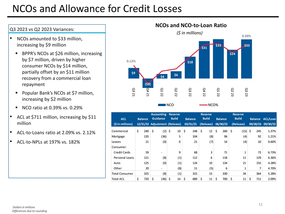 Non-Performing Assets Q3 2023 vs Q2 2023 Variances: Non-Performing Assets • NPAs and NPLs decreased by $28 million and $24 million, $900 4.00% respectively $800 3.50% $710 $700 ▪ NPL inflows decreased by $6 million $633 $610 3.00% $570 $547 $600 $529 ▪ P.R. NPLs at $334 million, or 1.4% of loans, down by $504 2.50% $472 $444 $500 $19 million, mainly driven by lower commercial and 2.00% $400 mortgage NPLs by $16 million and $7 million, 1.50% $300 respectively, offset in part by higher consumer NPLs by 1.00% $5 million $200 1.0% 0.9% 0.8% 0.8% 0.8% 0.8% 0.50% $100 0.7% 0.7% ▪ U.S. NPLs at $28 million, or 0.3% of loans, down by $5 0.6% $- 0.00% million, mostly driven by lower commercial and Q3 21 Q4 21 Q1 22 Q2 22 Q3 22 Q4 22 Q1 23 Q2 23 Q3 23 mortgage NPLs by $3 million each NPLs OREO NPL HFS NPAs/Total Assets • OREOs decreased by $4 million 4.0% Non-Performing Loans Total NPL Inflows 3.5% $633 3.0% $51 $35 $548 $39 $44 $40 $46 $520 2.5% $38 $40 $478 $453 $37 $439 $412 2.0% 2.2% $386 $362 1.9% 1.5% 1.8% 1.6% 1.4% 1.4% 1.3% 1.0% $20 1.2% 1.1% $15 $12 0.5% $11 $10 $9 $9 $6 $6 0.0% Q3 21 Q4 21 Q1 22 Q2 22 Q3 22 Q4 22 Q1 23 Q2 23 Q3 23 Q3 21 Q4 21 Q1 22 Q2 22 Q3 22 Q4 22 Q1 23 Q2 23 Q3 23 Commercial & Construction Mortgage Other NPL/Loans U.S. Inflows P.R. Inflows 10 Dollars in millions Differences due to rounding