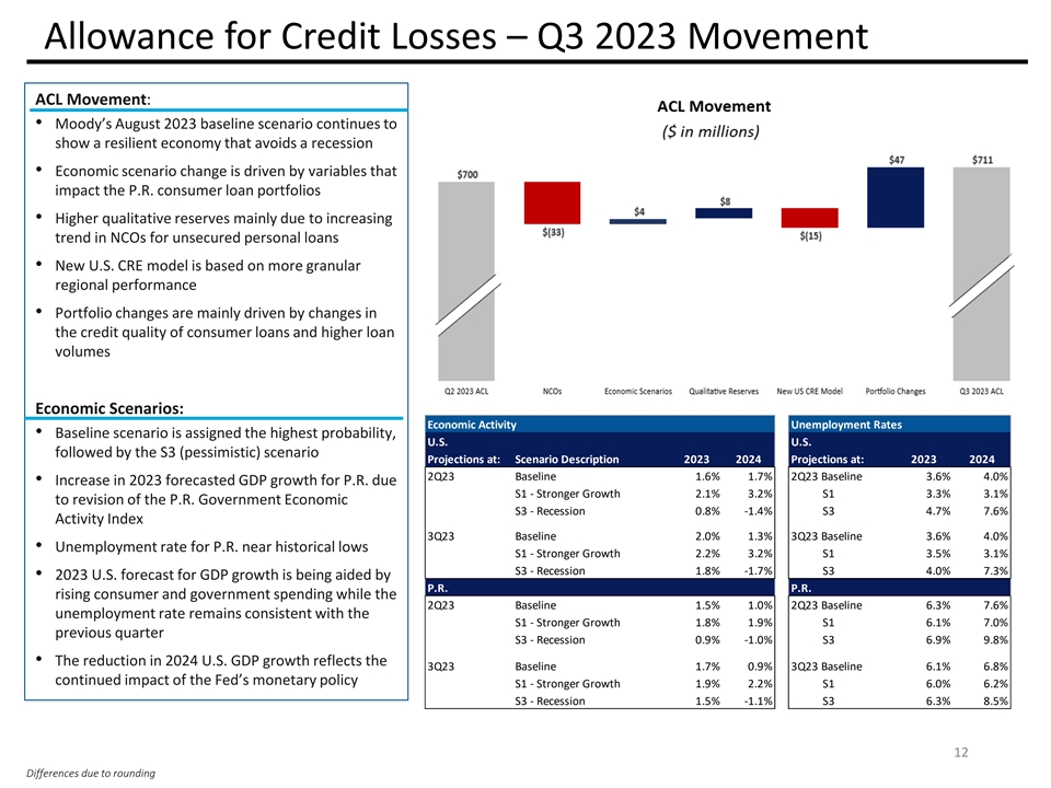 Q3 23 Q2 23 Q1 23 Q4 22 Q3 22 Q2 22 Q1 22 Q4 21 Q3 21 NCOs and Allowance for Credit Losses NCOs and NCO-to-Loan Ratio Q3 2023 vs Q2 2023 Variances: ($ in millions) 0.39% • NCOs amounted to $33 million, increasing by $9 million $33 $33 $31 ▪ BPPR’s NCOs at $26 million, increasing $24 by $7 million, driven by higher 0.12% $18 consumer NCOs by $14 million, partially offset by an $11 million $9 $6 $4 recovery from a commercial loan ($8) repayment ▪ Popular Bank’s NCOs at $7 million, increasing by $2 million NCO NCO% ▪ NCO ratio at 0.39% vs. 0.29% Accounting Reserve Reserve Reserve • ACL at $711 million, increasing by $11 Guidance Build Build Build ACL Balance Balance Balance Balance ACL/Loan million ($ in millions) 12/31/22 Adjustment (Release) 03/31/23 (Release) 06/30/23 (Release) 09/30/23 09/30/23 Commercial $ 240 $ (2) $ 10 $ 248 $ 12 $ 260 $ (15) $ 245 1.37% • ACL-to-Loans ratio at 2.09% vs. 2.12% Mortgage 135 (36) 5 104 (8) 96 (4) 92 1.21% Leases 21 (0) 0 21 (7) 14 (4) 10 0.60% • ACL-to-NPLs at 197% vs. 182% Consumer: Credit Cards 59 - 9 68 3 71 1 73 6.73% Personal Loans 121 (8) (1) 112 6 118 11 129 6.36% Auto 125 (0) (1) 124 10 134 21 155 4.28% Other 20 - (8) 11 (5) 6 1 7 4.70% Total Consumer 325 (8) (1) 315 15 330 34 364 5.28% Total ACL $ 720 $ (46) $ 14 $ 689 $ 11 $ 700 $ 11 $ 711 2.09% 11 Dollars in millions Differences due to rounding