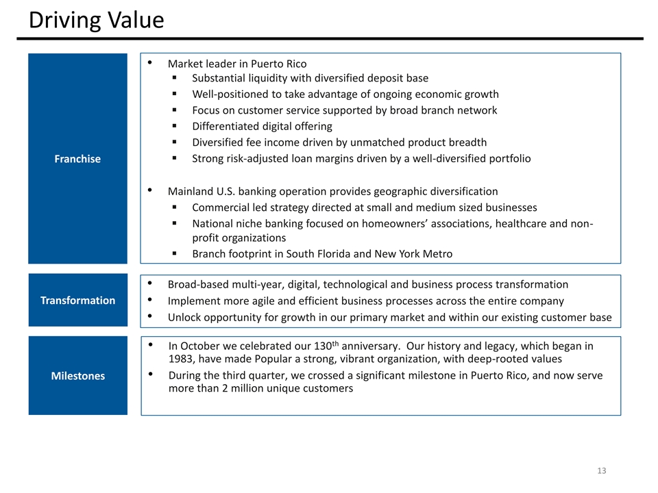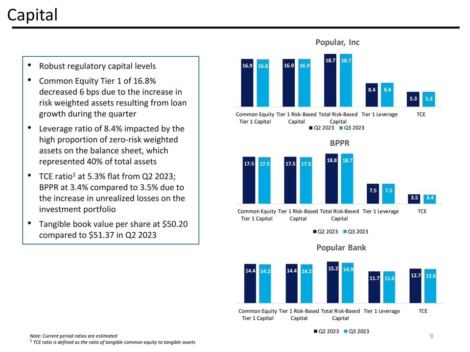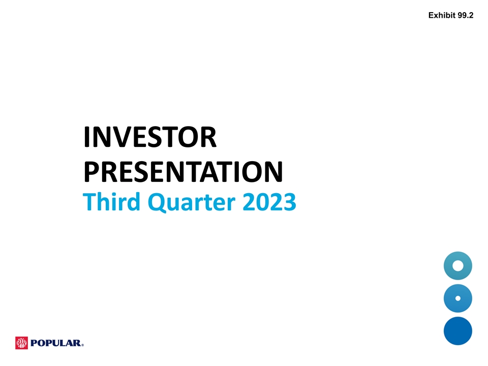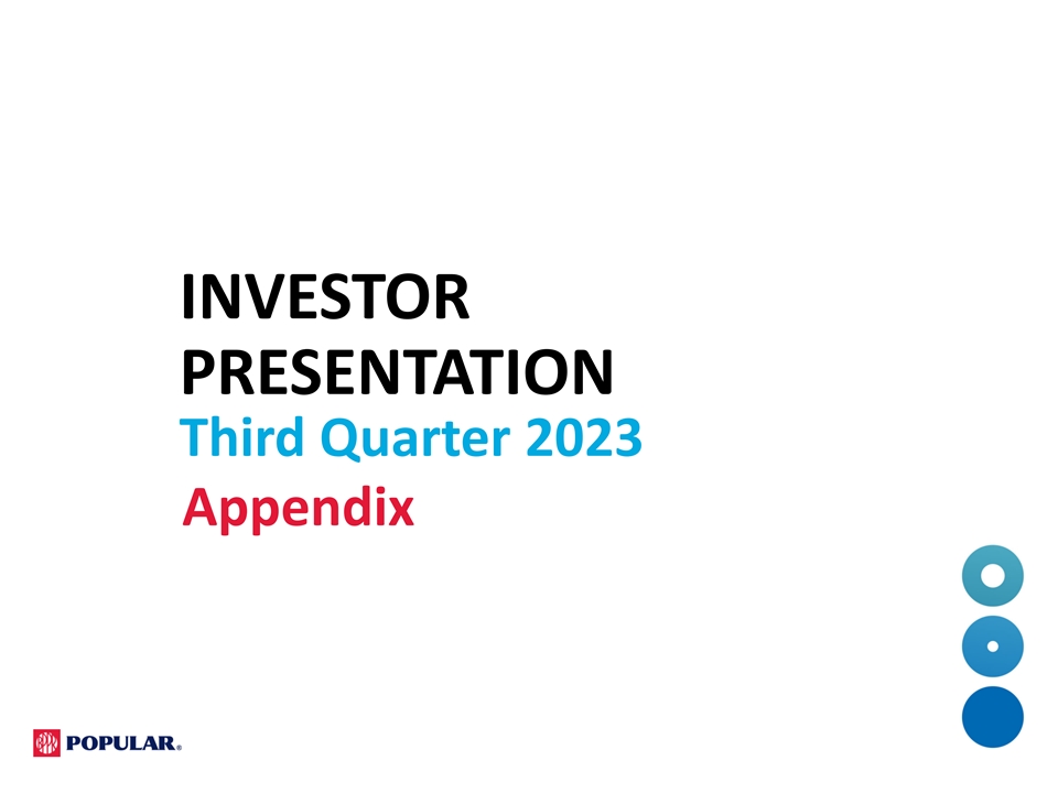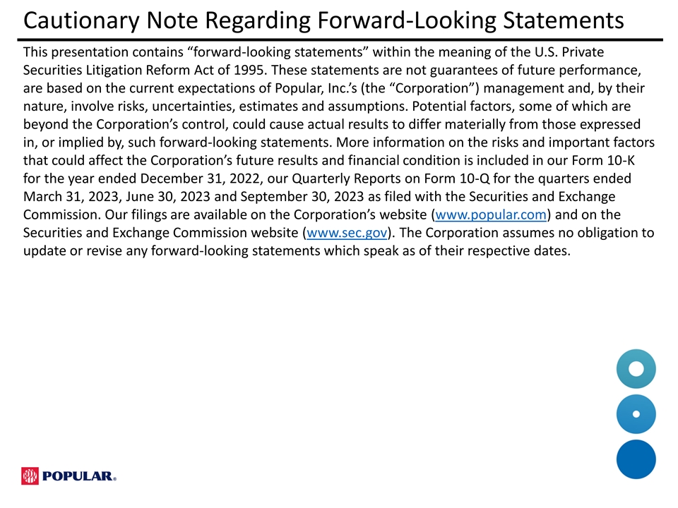 Cautionary Note Regarding Forward-Looking Statements This presentation contains “forward-looking statements” within the meaning of the U.S. Private Securities Litigation Reform Act of 1995. These statements are not guarantees of future performance, are based on the current expectations of Popular, Inc.’s (the “Corporation”) management and, by their nature, involve risks, uncertainties, estimates and assumptions. Potential factors, some of which are beyond the Corporation’s control, could cause actual results to differ materially from those expressed in, or implied by, such forward-looking statements. More information on the risks and important factors that could affect the Corporation’s future results and financial condition is included in our Form 10-K for the year ended December 31, 2022, our Quarterly Reports on Form 10-Q for the quarters ended March 31, 2023, June 30, 2023 and September 30, 2023 as filed with the Securities and Exchange Commission. Our filings are available on the Corporation’s website (www.popular.com) and on the Securities and Exchange Commission website (www.sec.gov). The Corporation assumes no obligation to update or revise any forward-looking statements which speak as of their respective dates.
