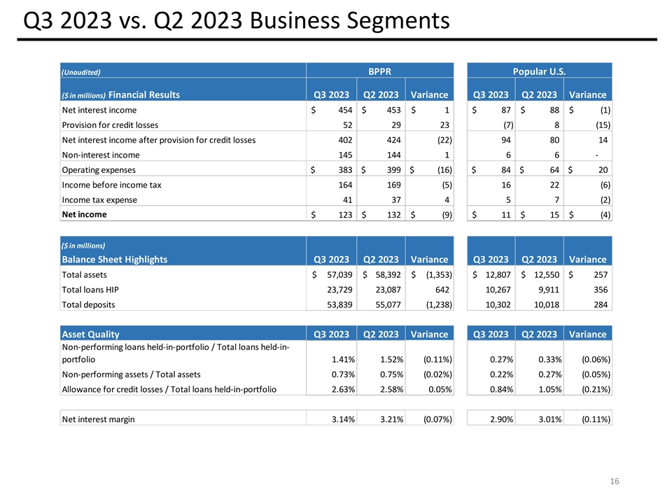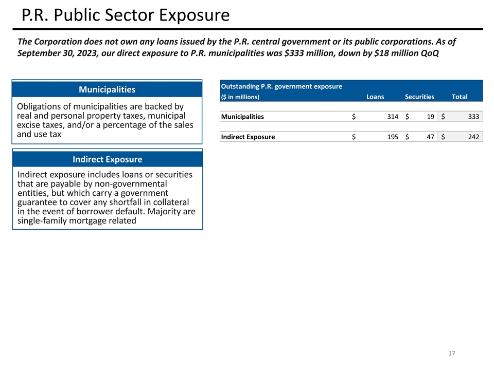 Q3 2023 vs. Q2 2023 Business Segments (Unaudited) BPPR Popular U.S. ($ in millions) Financial Results Q3 2023 Q2 2023 Variance Q3 2023 Q2 2023 Variance Net interest income $ 454 $ 453 $ 1 $ 87 $ 88 $ ( 1) Provision for credit losses 52 29 23 (7) 8 (15) Net interest income after provision for credit losses 402 424 (22) 94 80 14 Non-interest income 145 144 1 6 6 - Operating expenses $ 383 $ 399 $ (16) $ 84 $ 64 $ 20 Income before income tax 164 169 (5) 16 22 (6) Income tax expense 41 37 4 5 7 (2) Net income $ 123 $ 132 $ ( 9) $ 11 $ 15 $ ( 4) ($ in millions) Balance Sheet Highlights Q3 2023 Q2 2023 Variance Q3 2023 Q2 2023 Variance Total assets $ 5 7,039 $ 58,392 $ (1,353) $ 1 2,807 $ 12,550 $ 257 Total loans HIP 23,729 2 3,087 642 10,267 9,911 356 Total deposits 53,839 55,077 ( 1,238) 10,302 1 0,018 284 Asset Quality Q3 2023 Q2 2023 Variance Q3 2023 Q2 2023 Variance Non-performing loans held-in-portfolio / Total loans held-in- portfolio 1.41% 1.52% (0.11%) 0.27% 0.33% (0.06%) Non-performing assets / Total assets 0.73% 0.75% (0.02%) 0.22% 0.27% (0.05%) Allowance for credit losses / Total loans held-in-portfolio 2.63% 2.58% 0.05% 0.84% 1.05% (0.21%) Net interest margin 3.14% 3.21% (0.07%) 2.90% 3.01% (0.11%) 16