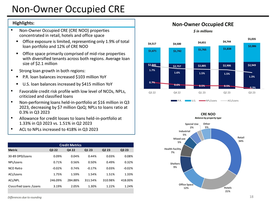 P.R. Public Sector Exposure The Corporation does not own any loans issued by the P.R. central government or its public corporations. As of September 30, 2023, our direct exposure to P.R. municipalities was $333 million, down by $18 million QoQ Outstanding P.R. government exposure Municipalities ($ in millions) Loans Securities Total Obligations of municipalities are backed by real and personal property taxes, municipal Municipalities $ 314 $ 19 $ 333 excise taxes, and/or a percentage of the sales and use tax Indirect Exposure $ 195 $ 47 $ 242 Indirect Exposure Indirect exposure includes loans or securities that are payable by non-governmental entities, but which carry a government guarantee to cover any shortfall in collateral in the event of borrower default. Majority are single-family mortgage related 17