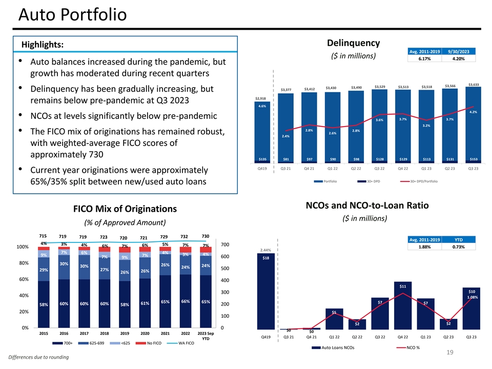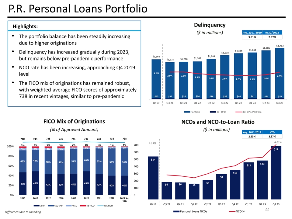 P.R. Personal Loans Portfolio Delinquency Highlights: Avg. 2011-2019 9/30/2023 ($ in millions) • The portfolio balance has been steadily increasing 3.61% 2.87% $2,000 6.00% due to higher originations $1,763 $1,686 $1,800 $1,613 $1,586 5.00% $1,518 • Delinquency has increased gradually during 2023, $1,600 $1,388 $1,368 $1,303 $1,288 but remains below pre-pandemic performance $1,400 $1,275 4.00% $1,200 • NCO rate has been increasing, approaching Q4 2019 $1,000 3.00% 3.2% level 2.9% 2.9% 2.9% $800 2.7% 2.6% 2.6% 2.6% 2.5% 2.5% 2.00% $600 • The FICO mix of originations has remained robust, $400 1.00% with weighted-average FICO scores of approximately $200 $43 $37 $37 $36 $36 $39 $40 $41 $44 $51 738 in recent vintages, similar to pre-pandemic $- 0.00% Q419 Q3 21 Q4 21 Q1 22 Q2 22 Q3 22 Q4 22 Q1 23 Q2 23 Q3 23 Portfolio 30+ DPD 30+ DPD/Portfolio FICO Mix of Originations NCOs and NCO-to-Loan Ratio (% of Approved Amount) ($ in millions) Avg. 2011-2019 YTD 2.53% 3.37% 738 738 738 740 743 736 741 746 740 4.01% 4.19% 2% 2% 1% 1% 700 3% 3% 3% 3% 1% 100% 3% 3% 3% 3% 3% 4% 4% 5% 5% $17 600 80% 500 $14 46% 44% 45% 51% 53% 50% 56% 56% 49% $13 $12 60% 400 $10 300 40% $8 200 49% 49% $6 47% 44% $6 $6 43% 43% 43% $5 20% 40% 40% 100 0% 0 2015 2016 2017 2018 2019 2020 2021 2022 2023 Sep YTD Q419 Q3 21 Q4 21 Q1 22 Q2 22 Q3 22 Q4 22 Q1 23 Q2 23 Q3 23 750+ 650-749 <650 No FICO WA FICO 22 Personal Loans NCOs NCO % Differences due to rounding