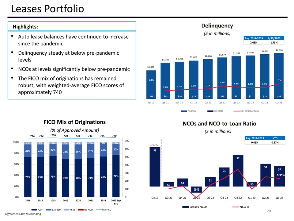 Auto Portfolio Delinquency Highlights: Avg. 2011-2019 9/30/2023 ($ in millions) 6.17% 4.20% • Auto balances increased during the pandemic, but growth has moderated during recent quarters $4,000 6.00% $3,633 $3,566 $3,529 $3,513 $3,518 $3,490 $3,430 $3,412 $3,377 • Delinquency has been gradually increasing, but $3,500 5.00% $2,918 remains below pre-pandemic at Q3 2023 $3,000 4.6% 4.00% 4.2% $2,500 • NCOs at levels significantly below pre-pandemic 3.7% 3.6% 3.7% $2,000 3.00% 3.2% 2.8% 2.8% • The FICO mix of originations has remained robust, $1,500 2.6% 2.4% 2.00% $1,000 with weighted-average FICO scores of 1.00% $500 approximately 730 $135 $81 $97 $90 $98 $128 $129 $113 $131 $153 $- 0.00% Q419 Q3 21 Q4 21 Q1 22 Q2 22 Q3 22 Q4 22 Q1 23 Q2 23 Q3 23 • Current year originations were approximately Portfolio 30+ DPD 30+ DPD/Portfolio 65%/35% split between new/used auto loans NCOs and NCO-to-Loan Ratio FICO Mix of Originations ($ in millions) (% of Approved Amount) 715 719 730 719 723 729 732 721 720 Avg. 2011-2019 YTD 4% 3% 5% 4% 6% 7% 700 6% 7% 7% 100% 1.88% 0.73% 2.44% 7% 6% 4% 3% 4% 9% 7% 7% 600 9% $18 80% 30% 26% 24% 30% 24% 500 29% 27% 26% 26% 60% 400 $11 $10 300 40% 1.08% 66% 65% 65% $7 61% $7 60% 60% 60% 58% 58% 200 20% $5 100 $2 $2 0% 0 $0 $0 2015 2016 2017 2018 2019 2020 2021 2022 2023 Sep Q419 Q3 21 Q4 21 Q1 22 Q2 22 Q3 22 Q4 22 Q1 23 Q2 23 Q3 23 YTD 700+ 625-699 <625 No FICO WA FICO Auto Loans NCOs NCO % 19 Differences due to rounding