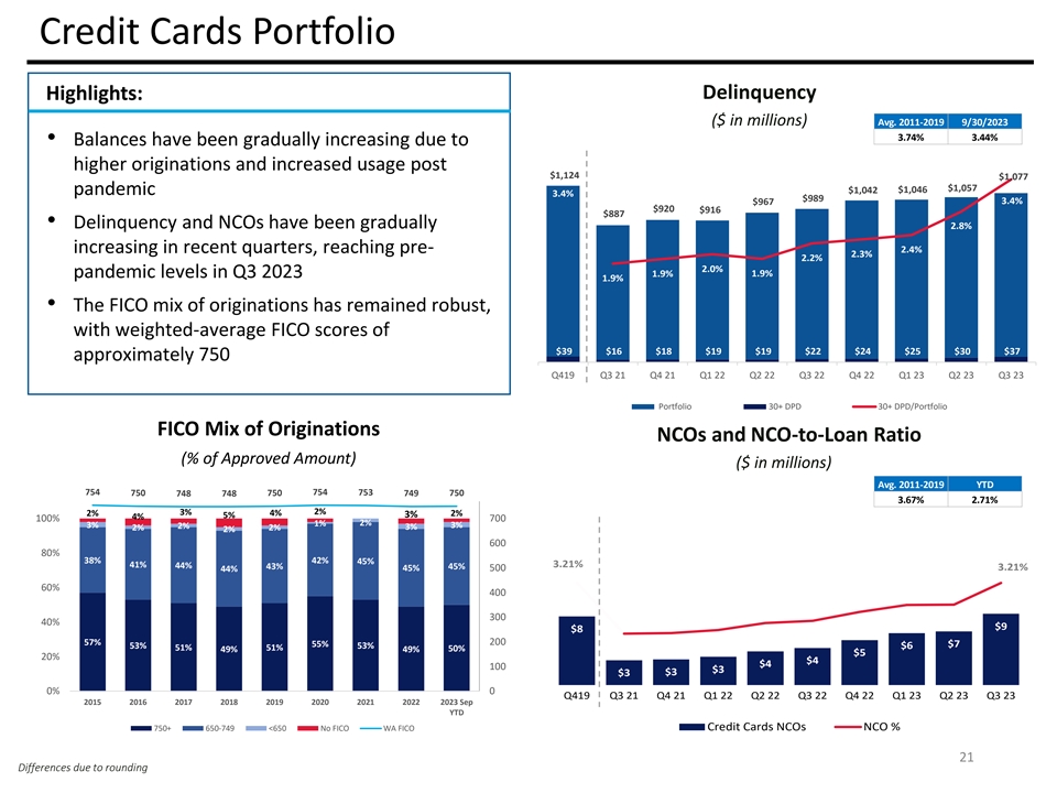 Leases Portfolio Delinquency Highlights: ($ in millions) • Auto lease balances have continued to increase Avg. 2011-2019 9/30/2023 2.06% 1.73% since the pandemic $2,000 6.00% $1,698 $1,800 $1,662 $1,614 $1,586 • Delinquency steady at below pre-pandemic $1,539 5.00% $1,480 $1,600 $1,426 $1,381 $1,349 levels $1,400 4.00% $1,200 $1,060 • NCOs at levels significantly below pre-pandemic $1,000 3.00% $800 • The FICO mix of originations has remained 1.8% 1.7% 2.00% 1.5% $600 1.4% 1.3% 1.3% 1.1% 1.1% robust, with weighted-average FICO scores of 1.0% 0.9% $400 1.00% approximately 740 $200 $19 $13 $14 $16 $17 $23 $21 $21 $22 $29 $- 0.00% Q419 Q3 21 Q4 21 Q1 22 Q2 22 Q3 22 Q4 22 Q1 23 Q2 23 Q3 23 Portfolio 30+ DPD 30+ DPD/Portfolio FICO Mix of Originations NCOs and NCO-to-Loan Ratio (% of Approved Amount) ($ in millions) 736 730 730 731 740 734 732 735 Avg. 2011-2019 YTD 700 100% 2% 0.65% 0.27% 3% 3% 3% 4% 4% 4% 4% 1.07% 600 20% 22% 24% $3 23% 23% 26% 26% 26% 80% 500 $2 60% 400 $2 $1 $1 300 40% 0.35% 77% 75% 73% 73% 74% 70% 70% 71% $1 200 $1 $0 $0 20% 100 ($0) 0% 0 Q419 Q3 21 Q4 21 Q1 22 Q2 22 Q3 22 Q4 22 Q1 23 Q2 23 Q3 23 2016 2017 2018 2019 2020 2021 2022 2023 Sep YTD Leases NCOs NCO % 700+ 625-699 <625 No FICO WA FICO 20 Differences due to rounding