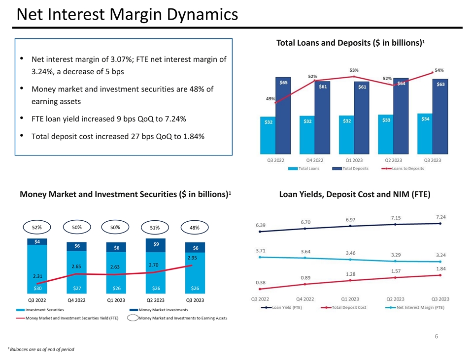 Net Interest Margin Dynamics 1 Total Loans and Deposits ($ in billions) • Net interest margin of 3.07%; FTE net interest margin of 3.24%, a decrease of 5 bps • Money market and investment securities are 48% of earning assets • FTE loan yield increased 9 bps QoQ to 7.24% • Total deposit cost increased 27 bps QoQ to 1.84% 1 Money Market and Investment Securities ($ in billions) Loan Yields, Deposit Cost and NIM (FTE) 52% 50% 50% 51% 48% $4 $9 $6 $6 $6 120% 2.95 2.70 2.65 100% 2.63 2.31 80% $30 $27 $26 $26 $26 60% Q3 2022 Q4 2022 Q1 2023 Q2 2023 Q3 2023 Investment Securities Money Market Investments 40% 20% 6 ¹ Balances are as of end of period 0%