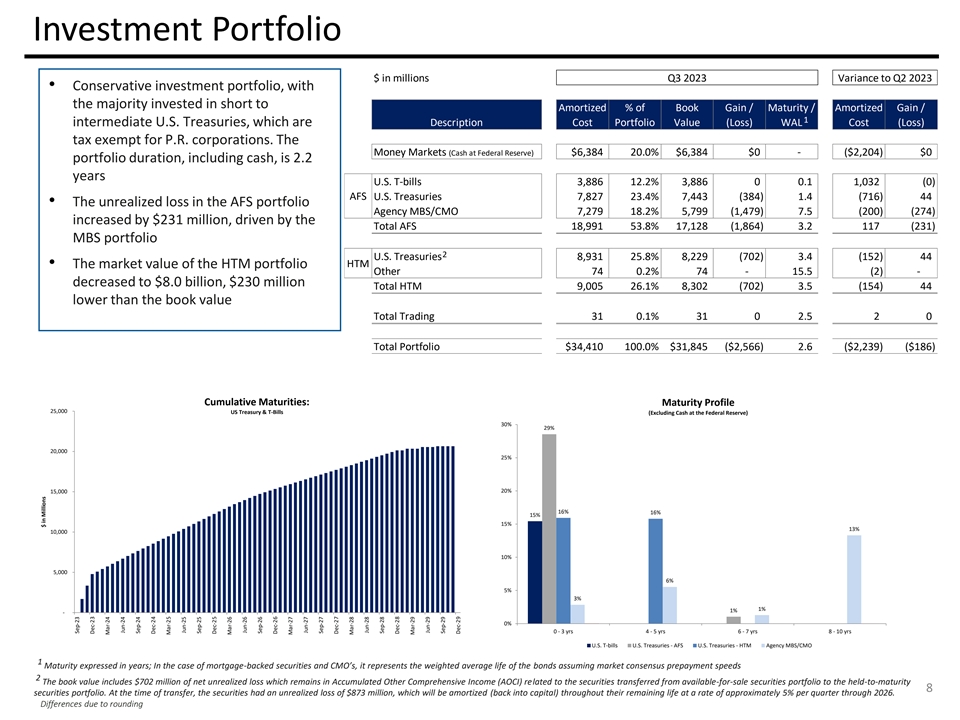 Investment Portfolio $ in millions Q3 2023 Variance to Q2 2023 Q2 2023 • Conservative investment portfolio, with the majority invested in short to Amortized % of Book Gain / Maturity / Amortized Gain / 1 intermediate U.S. Treasuries, which are Description Cost Portfolio Value (Loss) WAL Cost (Loss) tax exempt for P.R. corporations. The Money Markets (Cash at Federal Reserve) $6,384 20.0% $6,384 $0 - ($2,204) $0 portfolio duration, including cash, is 2.2 years U.S. T-bills 3,886 12.2% 3,886 0 0.1 1,032 (0) AFS U.S. Treasuries 7,827 23.4% 7,443 (384) 1.4 (716) 44 • The unrealized E ar loss nings in the AFS portfolio Agency MBS/CMO 7,279 18.2% 5,799 (1,479) 7.5 (200) (274) increased by $231 million, driven by the Total AFS 1 8,991 53.8% 17,128 (1 ,864) 3.2 117 (231) MBS portfolio 2 U.S. Treasuries 8,931 25.8% 8,229 (702) 3.4 (152) 44 • The market value of the HTM portfolio HTM Other 74 0.2% 74 - 15.5 (2) - decreased to $8.0 billion, $230 million Total HTM 9,005 26.1% 8,302 (702) 3.5 (154) 44 lower than the book value Total Trading 31 0.1% 31 0 2.5 2 0 Total Portfolio $34,410 100.0% $31,845 ($2,566) 2.6 ($2,239) ($186) Cumulative Maturities: Maturity Profile 25,000 US Treasury & T-Bills (Excluding Cash at the Federal Reserve) 30% 29% 20,000 25% 15,000 20% 16% 16% 15% 15% 13% 10,000 10% 5,000 6% 5% 3% 1% 1% - 0% 0% 0% 0% 0% 0% 0% 0% 0% 0% 0% 0% 0 - 3 yrs 4 - 5 yrs 6 - 7 yrs 8 - 10 yrs U.S. T-bills U.S. Treasuries - AFS U.S. Treasuries - HTM Agency MBS/CMO 1 Maturity expressed in years; In the case of mortgage-backed securities and CMO’s, it represents the weighted average life of the bonds assuming market consensus prepayment speeds 2 The book value includes $702 million of net unrealized loss which remains in Accumulated Other Comprehensive Income (AOCI) related to the securities transferred from available-for-sale securities portfolio to the held-to-maturity 8 securities portfolio. At the time of transfer, the securities had an unrealized loss of $873 million, which will be amortized (back into capital) throughout their remaining life at a rate of approximately 5% per quarter through 2026. Differences due to rounding $ in Millions Sep-23 Dec-23 Mar-24 Jun-24 Sep-24 Dec-24 Mar-25 Jun-25 Sep-25 Dec-25 Mar-26 Jun-26 Sep-26 Dec-26 Mar-27 Jun-27 Sep-27 Dec-27 Mar-28 Jun-28 Sep-28 Dec-28 Mar-29 Jun-29 Sep-29 Dec-29