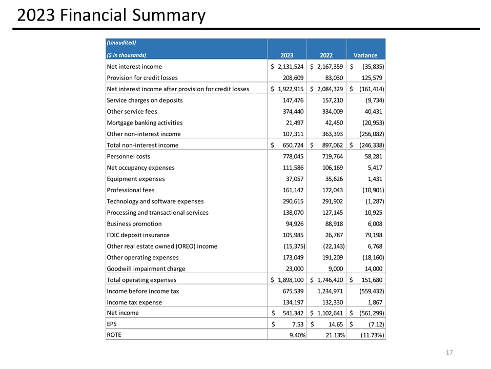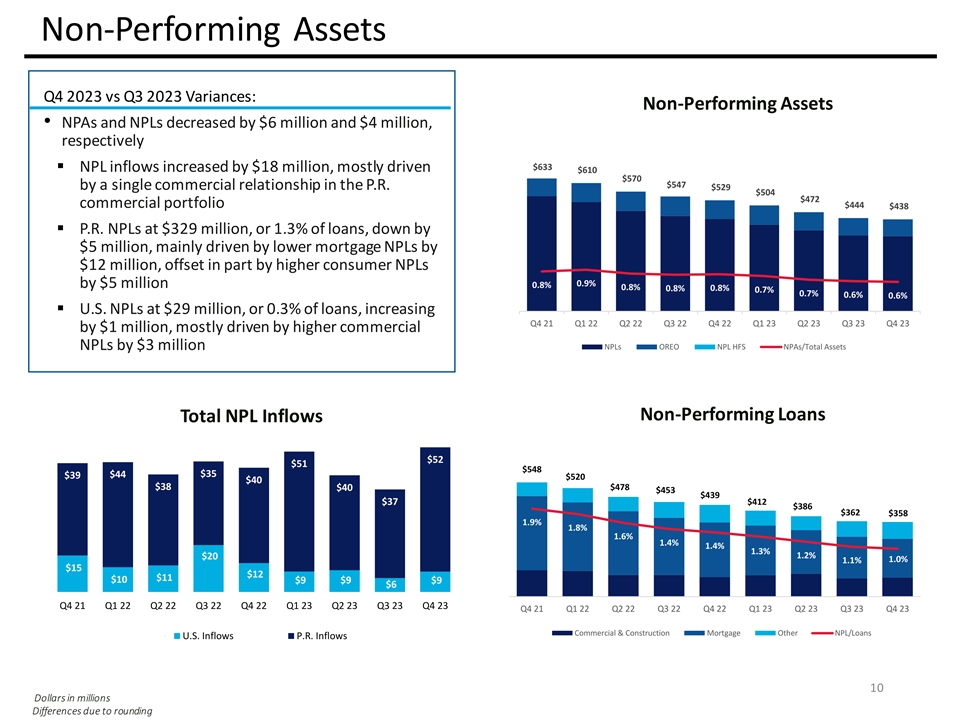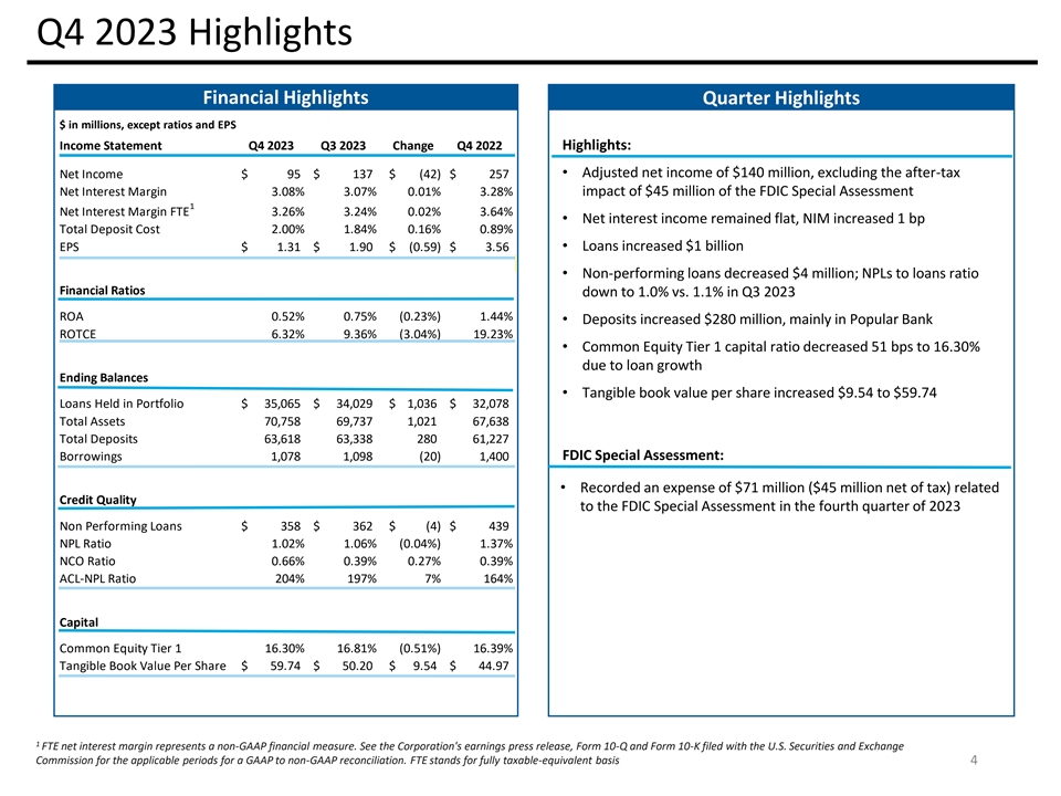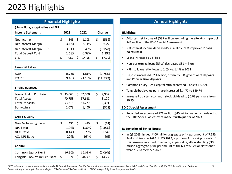 2023 Highlights Financial Highlights Annual Highlights $ in millions, except ratios and EPS Income Statement 2023 2022 Change Highlights: • Adjusted net income of $587 million, excluding the after-tax impact of Net Income $ 541 $ 1,103 $ ( 562) $45 million of the FDIC Special Assessment Net Interest Margin 3.13% 3.11% 0.02% 1 • Net interest income decreased $36 million, NIM improved 2 basis Net Interest Margin FTE 3.31% 3.46% (0.15%) points (bps) Total Deposit Cost 1.68% 0.39% 1.29% • Loans increased $3 billion EPS $ 7.53 $ 14.65 $ ( 7.12) • Non-performing loans (NPLs) decreased $81 million Financial Ratios • NPLs to loans ratio down to 1.0% vs. 1.4% in 2022 ROA 0.76% 1.51% (0.75%) • Deposits increased $2.4 billion, driven by P.R. government deposits ROTCE 9.40% 21.13% (11.73%) and Popular Bank deposits • Common Equity Tier 1 capital ratio decreased 9 bps to 16.30% Ending Balances • Tangible book value per share increased $14.77 to $59.74 Loans Held in Portfolio $ 35,065 $ 32,078 $ 2,987 • Increased quarterly common stock dividend to $0.62 per share from Total Assets 70,758 67,638 3,120 $0.55 Total Deposits 63,618 61,227 2,391 Borrowings 1,078 1,400 (322) FDIC Special Assessment: • Recorded an expense of $71 million ($45 million net of tax) related to Credit Quality the FDIC Special Assessment in the fourth quarter of 2023 Non Performing Loans $ 358 $ 439 $ ( 81) NPL Ratio 1.02% 1.37% (0.35%) Redemption of Senior Notes: NCO Ratio 0.44% 0.20% 0.24% • In Q1 2023, issued $400 million aggregate principal amount of 7.25% ACL-NPL Ratio 204% 164% 40% Senior Notes due 2028. In Q3 2023, a portion of the net proceeds of this issuance was used to redeem, at par value, all outstanding $300 Capital million aggregate principal amount of the 6.125% Senior Notes that were due September 2023 Common Equity Tier 1 16.30% 16.39% (0.09%) Tangible Book Value Per Share $ 59.74 $ 44.97 $ 14.77 1 FTE net interest margin represents a non-GAAP financial measure. See the Corporation's earnings press release, Form 10-Q and Form 10-K filed with the U.S. Securities and Exchange 3 Commission for the applicable periods for a GAAP to non-GAAP reconciliation. FTE stands for fully taxable-equivalent basis