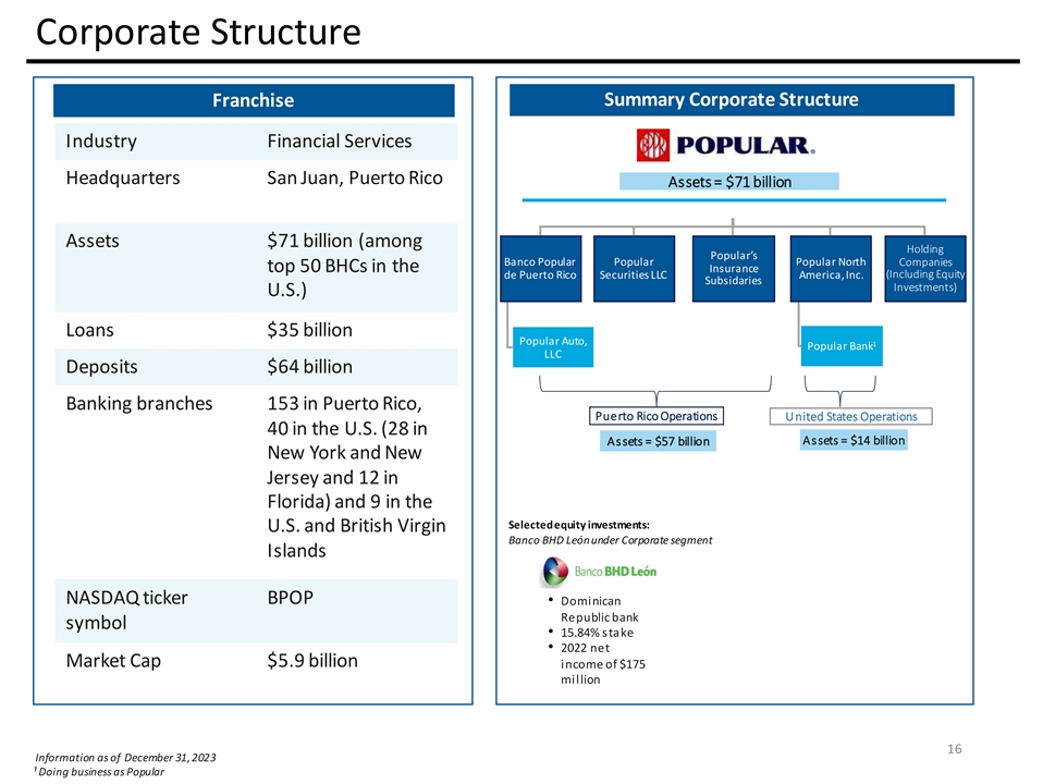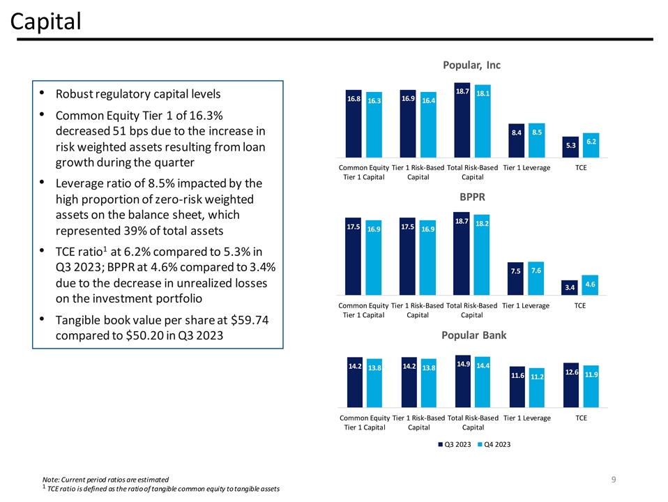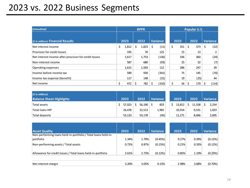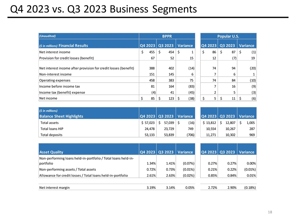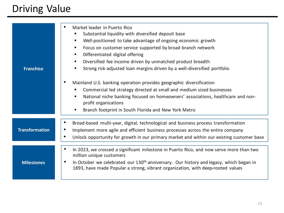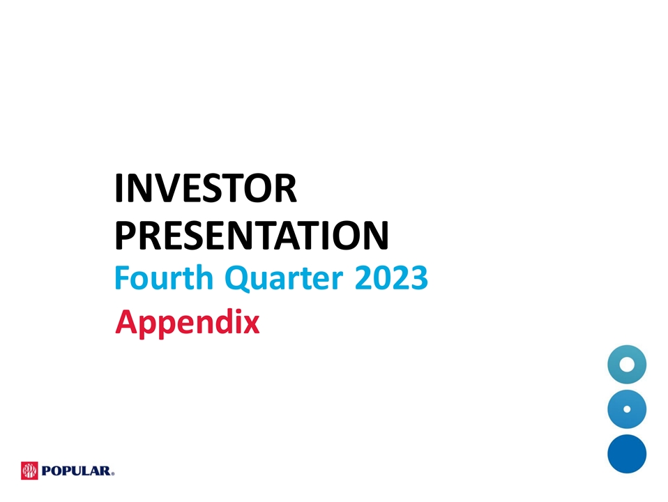 Cautionary Note Regarding Forward-Looking Statements This presentation contains “forward-looking statements” within the meaning of the U.S. Private Securities Litigation Reform Act of 1995, including without limitation those regarding Popular’s business, financial condition, results of operations and future plans, objectives, performance, earnings and expenses. These statements are not guarantees of future performance, are based on the current expectations of Popular, Inc.’s (the “Corporation”) management and, by their nature, involve risks, uncertainties, estimates and assumptions. Potential factors, some of which are beyond the Corporation’s control, could cause actual results to differ materially from those expressed in, or implied by, such forward-looking statements. More information on the risks and important factors that could affect the Corporation’s future results and financial condition is included in our Form 10-K for the year ended December 31, 2022, our Quarterly Reports on Form 10-Q for the quarters ended March 31, 2023, June 30, 2023 and September 30, 2023, in our earnings release for the quarter ended December 31, 2023, and in our Annual Report on form 10-K for the year ended December 31, 2023 to be filed with the Securities and Exchange Commission. Our filings are available on the Corporation’s website (www.popular.com) and on the Securities and Exchange Commission website (www.sec.gov). The Corporation assumes no obligation to update or revise any forward-looking statements which speak as of their respective dates.