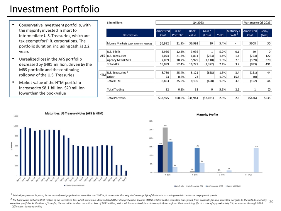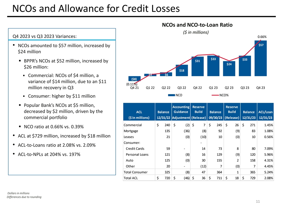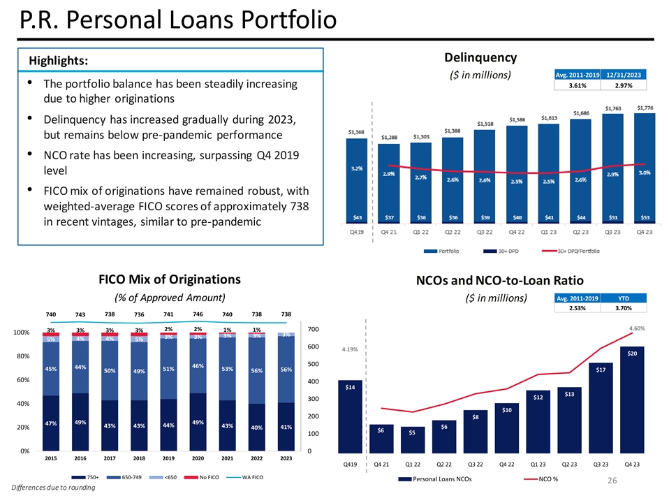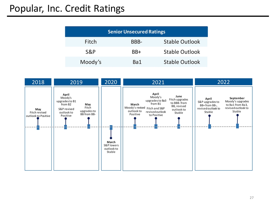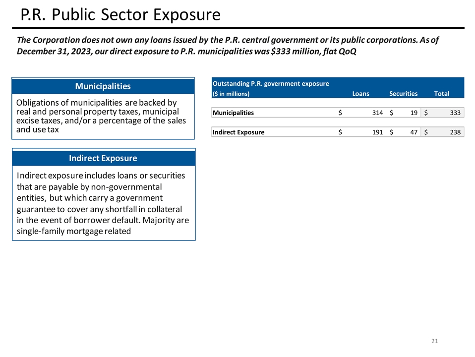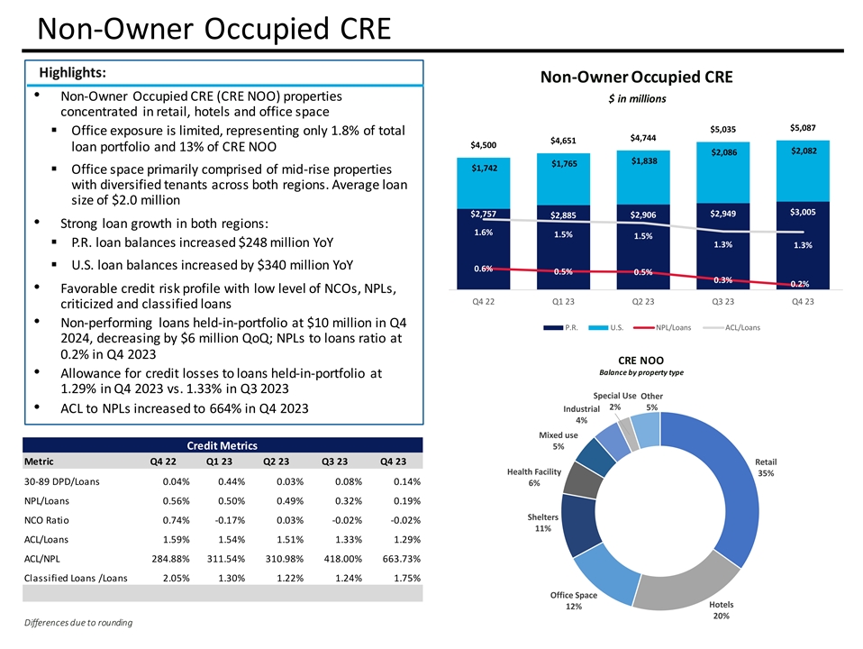 Cautionary Note Regarding Forward-Looking Statements This presentation contains “forward-looking statements” within the meaning of the U.S. Private Securities Litigation Reform Act of 1995, including without limitation those regarding Popular’s business, financial condition, results of operations and future plans, objectives, performance, earnings and expenses. These statements are not guarantees of future performance, are based on the current expectations of Popular, Inc.’s (the “Corporation”) management and, by their nature, involve risks, uncertainties, estimates and assumptions. Potential factors, some of which are beyond the Corporation’s control, could cause actual results to differ materially from those expressed in, or implied by, such forward-looking statements. More information on the risks and important factors that could affect the Corporation’s future results and financial condition is included in our Form 10-K for the year ended December 31, 2022, our Quarterly Reports on Form 10-Q for the quarters ended March 31, 2023, June 30, 2023 and September 30, 2023, in our earnings release for the quarter ended December 31, 2023, and in our Annual Report on form 10-K for the year ended December 31, 2023 to be filed with the Securities and Exchange Commission. Our filings are available on the Corporation’s website (www.popular.com) and on the Securities and Exchange Commission website (www.sec.gov). The Corporation assumes no obligation to update or revise any forward-looking statements which speak as of their respective dates.