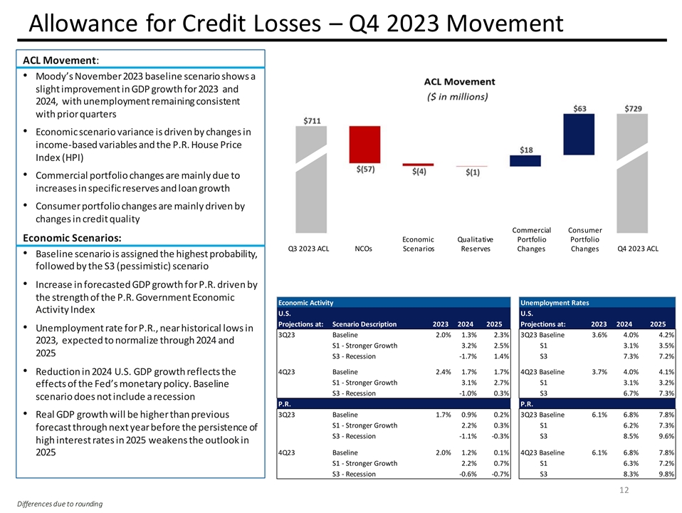NCOs and Allowance for Credit Losses NCOs and NCO-to-Loan Ratio ($ in millions) Q4 2023 vs Q3 2023 Variances: 0.66% $57 • NCOs amounted to $57 million, increased by $24 million $33 $33 $31 ▪ BPPR’s NCOs at $52 million, increased by $24 $26 million: $18 $4 $6 ▪ Commercial: NCOs of $4 million, a ($8) variance of $14 million, due to an $11 (0.11%) million recovery in Q3 Q4 21 Q1 22 Q2 22 Q3 22 Q4 22 Q1 23 Q2 23 Q3 23 Q4 23 NCO NCO% ▪ Consumer: higher by $11 million ▪ Popular Bank’s NCOs at $5 million, Accounting Reserve Reserve decreased by $2 million, driven by the Guidance Build Build ACL Balance Balance Balance ACL/Loan ($ in millions) 12/31/22 Adjustment (Release) 09/30/23 (Release) 12/31/23 12/31/23 commercial portfolio Commercial $ 240 $ (2) $ 7 $ 245 $ 26 $ 271 1.45% ▪ NCO ratio at 0.66% vs. 0.39% Mortgage 135 (36) (8) 92 (9) 83 1.08% • ACL at $729 million, increased by $18 million Leases 21 (0) (10) 10 (0) 10 0.56% Consumer: - • ACL-to-Loans ratio at 2.08% vs. 2.09% Credit Cards 59 - 14 73 8 80 7.09% • ACL-to-NPLs at 204% vs. 197% Personal Loans 121 (8) 16 129 (9) 120 5.96% Auto 125 (0) 30 155 2 158 4.31% Other 20 - (12) 7 (0) 7 4.45% Total Consumer 325 (8) 47 364 1 365 5.24% Total ACL $ 720 $ (46) $ 36 $ 711 $ 18 $ 729 2.08% Dollars in millions Differences due to rounding 11