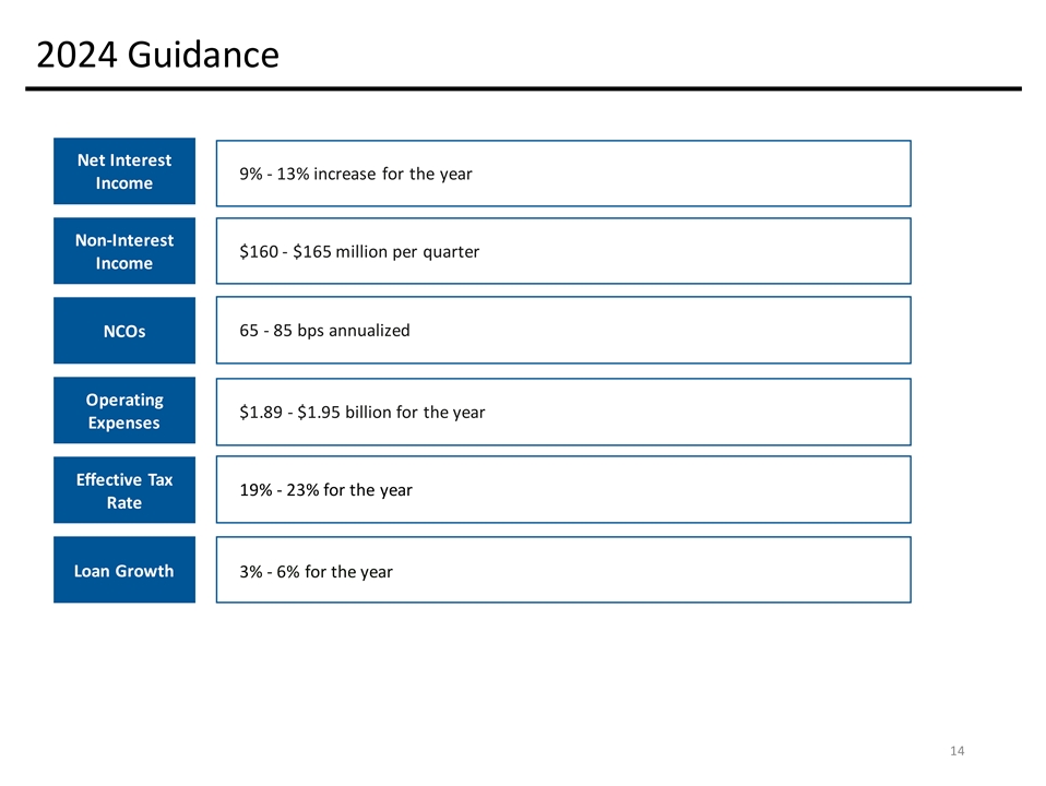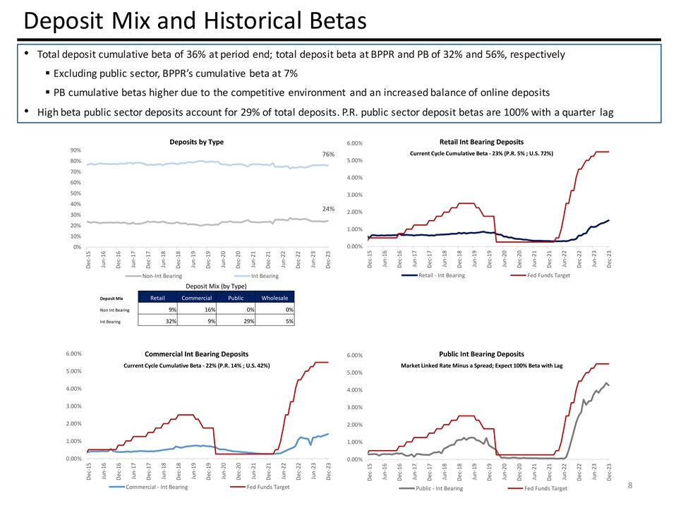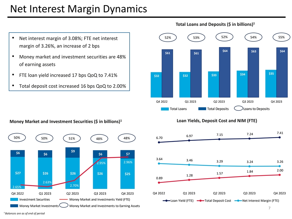 Net Interest Margin Dynamics 1 Total Loans and Deposits ($ in billions) $80 52% 54% 55% 52% 53% • Net interest margin of 3.08%; FTE net interest $70 margin of 3.26%, an increase of 2 bps $60 $64 $63 $64 $61 $61 • Money market and investment securities are 48% $50 of earning assets $40 $35 $30 $34 $33 $32 • FTE loan yield increased 17 bps QoQ to 7.41% $32 $20 • Total deposit cost increased 16 bps QoQ to 2.00% $10 $- Q4 2022 Q1 2023 Q2 2023 Q3 2023 Q4 2023 Total Loans Total Deposits Loans to Deposits 1 Loan Yields, Deposit Cost and NIM (FTE) Money Market and Investment Securities ($ in billions) 7.41 7.24 7.15 6.97 50% 6.70 50% 51% 48% 48% $9 $6 3% $6 $6 $7 3.64 3.46 3.29 3.24 3.26 2.96% 3% 2.95% 2.00 3% 1.84 $27 $26 1.57 $26 $26 $25 1.28 0.89 3% 2.63% 2.70% 2.65% 3% Q4 2022 Q1 2023 Q2 2023 Q3 2023 Q4 2023 Q4 2022 Q1 2023 Q2 2023 Q3 2023 Q4 2023 3% Investment Securities Money Market and Investments Yield (FTE) Loan Yield (FTE) Total Deposit Cost Net Interest Margin (FTE) Money Market Investments Money Market and Investments to Earning Assets 2% 7 ¹ Balances are as of end of period