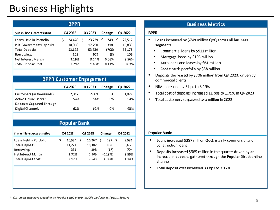 Q4 2023 Highlights Financial Highlights Quarter Highlights $ in millions, except ratios and EPS Income Statement Q4 2023 Q3 2023 Change Q4 2022 Highlights: • Adjusted net income of $140 million, excluding the after-tax Net Income $ 95 $ 137 $ (42) $ 257 Net Interest Margin 3.08% 3.07% 0.01% 3.28% impact of $45 million of the FDIC Special Assessment 1 Net Interest Margin FTE 3.26% 3.24% 0.02% 3.64% • Net interest income remained flat, NIM increased 1 bp Total Deposit Cost 2.00% 1.84% 0.16% 0.89% EPS $ 1.31 $ 1.90 $ (0.59) $ 3.56• Loans increased $1 billion • Non-performing loans decreased $4 million; NPLs to loans ratio Financial Ratios down to 1.0% vs. 1.1% in Q3 2023 ROA 0.52% 0.75% (0.23%) 1.44% • Deposits increased $280 million, mainly in Popular Bank ROTCE 6.32% 9.36% (3.04%) 19.23% • Common Equity Tier 1 capital ratio decreased 51 bps to 16.30% due to loan growth Ending Balances • Tangible book value per share increased $9.54 to $59.74 Loans Held in Portfolio $ 35,065 $ 34,029 $ 1,036 $ 32,078 Total Assets 70,758 69,737 1 ,021 67,638 Total Deposits 63,618 63,338 280 61,227 FDIC Special Assessment: Borrowings 1,078 1,098 ( 20) 1,400 • Recorded an expense of $71 million ($45 million net of tax) related Credit Quality to the FDIC Special Assessment in the fourth quarter of 2023 Non Performing Loans $ 358 $ 362 $ ( 4) $ 439 NPL Ratio 1.02% 1.06% (0.04%) 1.37% NCO Ratio 0.66% 0.39% 0.27% 0.39% ACL-NPL Ratio 204% 197% 7% 164% Capital Common Equity Tier 1 16.30% 16.81% (0.51%) 16.39% Tangible Book Value Per Share $ 59.74 $ 50.20 $ 9.54 $ 44.97 1 FTE net interest margin represents a non-GAAP financial measure. See the Corporation's earnings press release, Form 10-Q and Form 10-K filed with the U.S. Securities and Exchange Commission for the applicable periods for a GAAP to non-GAAP reconciliation. FTE stands for fully taxable-equivalent basis 4