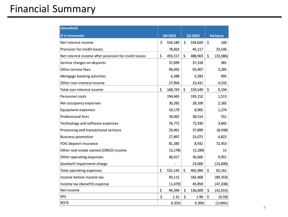 Business Highlights BPPR Business Metrics $ in millions, except ratios Q4 2023 Q3 2023 Change Q4 2022 BPPR: Loans Held in Portfolio $ 24,478 $ 23,729 $ 749 $ 22,512 • Loans increased by $749 million QoQ across all business P.R. Government Deposits 18,068 17,750 318 15,833 segments: Total Deposits 53,133 53,839 (706) 53,178 ▪ Commercial loans by $511 million Borrowings 105 108 (3) 109 ▪ Mortgage loans by $103 million Net Interest Margin 3.19% 3.14% 0.05% 3.26% ▪ Auto loans and leases by $61 million Total Deposit Cost 1.79% 1.68% 0.11% 0.83% ▪ Credit cards portfolio by $58 million • Deposits decreased by $706 million from Q3 2023, driven by BPPR Customer Engagement commercial clients • NIM increased by 5 bps to 3.19% Q4 2023 Q3 2023 Change Q4 2022 • Total cost of deposits increased 11 bps to 1.79% in Q4 2023 Customers (in thousands) 2,012 2 ,009 3 1 ,978 1 Active Online Users 54% 54% 0% 54% • Total customers surpassed two million in 2023 Deposits Captured Through Earnings Digital Channels 62% 62% 0% 63% Popular Bank Popular Bank: $ in millions, except ratios Q4 2023 Q3 2023 Change Q4 2022 Loans Held in Portfolio $ 10,554 $ 10,267 $ 287 $ 9,531 • Loans increased $287 million QoQ, mainly commercial and Total Deposits 11,271 10,302 969 8,666 construction loans Borrowings 381 398 ( 17) 794 • Deposits increased $969 million in the quarter driven by an Net Interest Margin 2.72% 2.90% (0.18%) 3.55% increase in deposits gathered through the Popular Direct online Total Deposit Cost 3.17% 2.84% 0.33% 1.34% channel • Total deposit cost increased 33 bps to 3.17%. 1 Customers who have logged on to Popular’s web and/or mobile platform in the past 30 days 5
