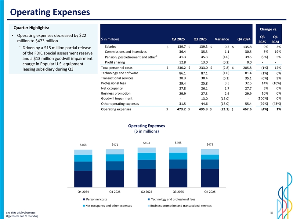 Non-Interest Income Quarter Highlights: Change vs. • Non-interest income of $166 million Q3 Q4 decreased $4 million ($ in millions) Q4 2025 Q3 2025 Variance Q4 2024 2025 2024 ⁻ Mainly in other operating income Service charges on deposits $ 38.9 $ 39.1 $ (0.2) $ 38.1 (0%) 2% due to a $5 million retroactive Debit card fees 30.4 28.1 2.3 26.9 8% 13% charge to a tenant in Q3 and an Credit card fees 32.8 32.7 0.1 30.8 0% 6% unfavorable variance of $4 million Other fees 11.4 11.2 0.2 10.8 2% 5% related to securities held for Banking fees $ 113.5 $ 111.0 $ 2.5 $ 106.6 2% 6% deferred benefit plans in Q4 which Insurance fees 14.5 13.0 1.5 14.6 11% (1%) has an offsetting effect on personnel costs Brokerage and asset management fees 10.2 9.5 0.7 9.5 8% 7% Trust fees 7.3 7.0 0.3 6.6 4% 10% Asset management and insurance fees $ 31.9 $ 29.5 $ 2.5 $ 30.8 8% 4% Mortgage banking activities 3.6 2.8 0.9 6.3 31% (43%) Other operating income 17.2 28.0 (10.7) 21.0 (38%) (18%) Non-interest income $ 166.3 $ 171.2 $ (4.9) $ 164.7 (3%) 1% Non-Interest Income ($ in millions) $171 $168 $168 $166 180 .00 180 .00 $152 160 .00 160 .00 140 .00 140 .00 120 .00 120 .00 100 .00 100 .00 80.0 0 80.0 0 60.0 0 60.0 0 40.0 0 40.0 0 20.0 0 20.0 0 - - Q4 2024 Q1 2025 Q2 2025 Q3 2025 Q4 2025 Banking fees Asset management and insurance Other operating income Mortgage banking activities Daily car rental income (sold in Q4 2024) 9 Differences due to rounding