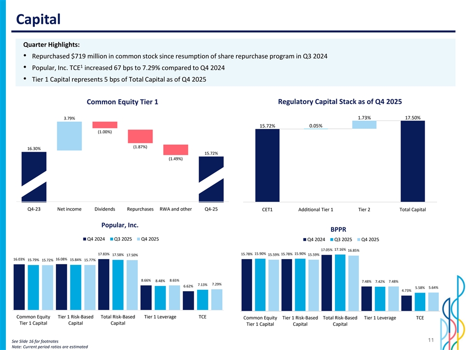 Operating Expenses Quarter Highlights: Change vs. • Operating expenses decreased by $22 Q3 Q4 $ in millions Q4 2025 Q3 2025 Variance Q4 2024 million to $473 million 2025 2024 Salaries $ 139.7 $ 139.3 $ 0.3 $ 135.8 0% 3% ⁻ Driven by a $15 million partial release Commissions and incentives 36.4 35.3 1.1 30.5 3% 19% of the FDIC special assessment reserve 1 41.3 45.3 (4.0) 39.5 (9%) 5% Pension, postretirement and other and a $13 million goodwill impairment Profit sharing 12.8 13.0 (0.2) 0.0 - - charge in Popular U.S. equipment Total personnel costs $ 230.2 $ 233.0 $ (2.8) $ 205.8 (1%) 12% leasing subsidiary during Q3 Technology and software (1.0) 81.4 86.1 87.1 (1%) 6% Transactional services 38.3 38.4 (0.1) 35.1 (0%) 9% Professional fees 3.5 32.5 14% (10%) 29.4 25.8 Net occupancy 27.8 26.1 1.7 27.7 6% 0% Business promotion 10% 0% 29.9 27.3 2.6 29.9 Goodwill impairment - 13.0 (13.0) - (100%) 0% Other operating expenses 31.5 44.6 (13.0) 55.4 (29%) (43%) Operating expenses $ 473.2 $ 495.3 $ (22.1) $ 467.6 (4%) 1% Operating Expenses ($ in millions) 600 .00 600 .00 $495 $493 $471 $473 $468 500 .00 500 .00 400 .00 400 .00 300 .00 300 .00 200 .00 200 .00 100 .00 100 .00 - - Q4 2024 Q1 2025 Q2 2025 Q3 2025 Q4 2025 Personnel costs Technology and professional fees Net occupancy and other expenses Business promotion and transactional services See Slide 16 for footnotes 10 Differences due to rounding