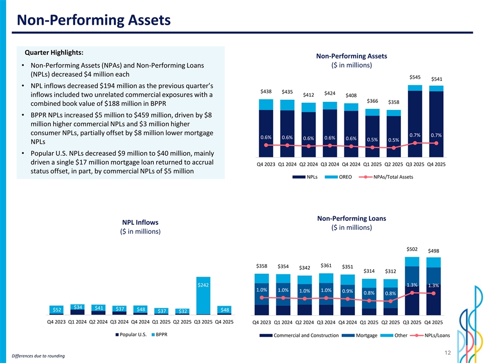 Capital Quarter Highlights: • Repurchased $719 million in common stock since resumption of share repurchase program in Q3 2024 1 • Popular, Inc. TCE increased 67 bps to 7.29% compared to Q4 2024 • Tier 1 Capital represents 5 bps of Total Capital as of Q4 2025 Common Equity Tier 1 Regulatory Capital Stack as of Q4 2025 1.73% 17.50% 3.79% 15.72% 0.05% (1.00%) (1.87%) 16.30% 15.72% (1.49%) Q4-23 Net income Dividends Repurchases RWA and other Q4-25 CET1 Additional Tier 1 Tier 2 Total Capital Popular, Inc. BPPR Q4 2024 Q3 2025 Q4 2025 Q4 2024 Q3 2025 Q4 2025 17.16% 17.05% 0.1 8 16.85% 15.90% 15.90% 17.83% 15.78% 15.78% 17.58% 17.50% 15.59% 15.59% 0.1 6 0.1 8 16.03% 16.08% 15.79% 15.72% 15.84% 15.77% 0.1 6 0.1 4 0.1 4 0.1 2 0.1 2 0.1 0.1 8.66% 8.48% 8.65% 7.48% 7.48% 7.42% 0.0 8 7.13% 7.29% 0.0 8 6.62% 5.58% 5.64% 0.0 6 4.73% 0.0 6 0.0 4 0.0 4 0.0 2 0.0 2 0 0 Common Equity Tier 1 Risk-Based Total Risk-Based Tier 1 Leverage TCE Common Equity Tier 1 Risk-Based Total Risk-Based Tier 1 Leverage TCE Tier 1 Capital Capital Capital Tier 1 Capital Capital Capital 11 See Slide 16 for footnotes Note: Current period ratios are estimated