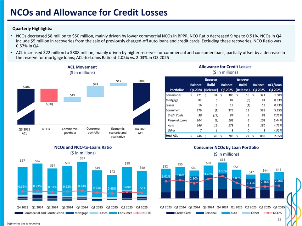 Non-Performing Assets Quarter Highlights: Non-Performing Assets ($ in millions) • Non-Performing Assets (NPAs) and Non-Performing Loans (NPLs) decreased $4 million each 0.040000000 600 $545 $541 • NPL inflows decreased $194 million as the previous quarter’s 0.035000000 500 $438 $435 $424 inflows included two unrelated commercial exposures with a $412 $408 0.030000000 $366 $358 400 combined book value of $188 million in BPPR 0.025000000 • BPPR NPLs increased $5 million to $459 million, driven by $8 0.020000000 300 million higher commercial NPLs and $3 million higher 0.015000000 200 consumer NPLs, partially offset by $8 million lower mortgage 0.7% 0.7% 0.010000000 0.6% 0.6% 0.6% 0.6% 0.6% 0.5% 0.5% NPLs 100 0.005000000 • Popular U.S. NPLs decreased $9 million to $40 million, mainly 0 0.000000000 driven a single $17 million mortgage loan returned to accrual Q4 2023 Q1 2024 Q2 2024 Q3 2024 Q4 2024 Q1 2025 Q2 2025 Q3 2025 Q4 2025 status offset, in part, by commercial NPLs of $5 million NPLs OREO NPAs/Total Assets Non-Performing Loans NPL Inflows ($ in millions) ($ in millions) 600 0.04 $502 $498 400 0.035 500 0.03 $358 $361 $354 300 $351 400 $342 0.025 $314 $312 300 0.02 200 $242 1.3% 1.3% 0.015 1.0% 1.0% 1.0% 200 1.0% 0.9% 0.8% 0.8% 0.01 100 100 0.005 $34 $41 $37 $48 $52 $48 $37 $32 0 0 0 Q4 2023 Q1 2024 Q2 2024 Q3 2024 Q4 2024 Q1 2025 Q2 2025 Q3 2025 Q4 2025 Q4 2023 Q1 2024 Q2 2024 Q3 2024 Q4 2024 Q1 2025 Q2 2025 Q3 2025 Q4 2025 Popular U.S. BPPR Commercial and Construction Mortgage Other NPLs/Loans 12 Differences due to rounding