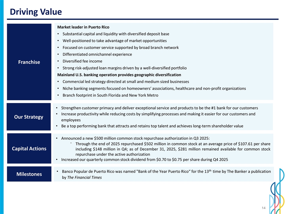 NCOs and Allowance for Credit Losses Quarterly Highlights: • NCOs decreased $8 million to $50 million, mainly driven by lower commercial NCOs in BPPR. NCO Ratio decreased 9 bps to 0.51%. NCOs in Q4 include $5 million in recoveries from the sale of previously charged-off auto loans and credit cards. Excluding these recoveries, NCO Ratio was 0.57% in Q4 • ACL increased $22 million to $808 million, mainly driven by higher reserves for commercial and consumer loans, partially offset by a decrease in the reserve for mortgage loans; ACL-to-Loans Ratio at 2.05% vs. 2.03% in Q3 2025 Allowance for Credit Losses ACL Movement ($ in millions) ($ in millions) 830 Reserve Reserve $12 $808 810 $41 Build Balance Balance Build Balance ACL/Loan 790 $786 Portfolios Q4 2024 (Release) Q3 2025 (Release) Q4 2025 Q4 2025 770 $19 Commercial $ 271 $ 34 $ 305 $ 16 $ 321 1.50% 750 Mortgage 82 5 87 (6) 81 0.93% 730 $(50) Leases 16 3 19 (1) 19 0.93% 710 Consumer: 376 ( 1) 375 13 388 5.35% 690 Credit Cards 99 (12) 87 4 91 7.25% 670 Personal Loans 104 (2) 102 6 108 5.44% 650 Auto 166 12 178 2 180 4.72% NCOs Consumer Changes Q4 2025 ACL Consumer Economic NCOs Commercial Q4 2025 Q3 2025 Q3 2025 ACL Commercial Changes Economic Scenarios and… Other 7 1 8 0 8 4.52% portfolio portfolio scenario and ACL ACL Total ACL $ 746 $ 40 $ 786 $ 22 $ 808 2.05% qualitative NCOs and NCO-to-Loans Ratio Consumer NCOs by Loan Portfolio ($ in millions) ($ in millions) 75 $67 70 $63 4.0 0% $57 $62 5.0 0% $59 $58 65 $58 60 $55 $54 $52 $51 $50 $49 $49 55 3.0 0% $46 50 $44 4.0 0% 3.56% $42 $42 45 3.26% 3.16% 40 3.01% 2.85% 2.0 0% 2.80% 35 3.0 0% 2.56% 30 2.46% 2.33% 25 0.71% 0.74% 0.66% 0.65% 0.61% 0.60% 20 0.53% 1.0 0% 0.51% 0.45% 15 2.0 0% 10 5 0.0 0% - 1.0 0% (5 ) (10) (1 5) -1.00% Q4 2023 Q1 2024 Q2 2024 Q3 2024 Q4 2024 Q1 2025 Q2 2025 Q3 2025 Q4 2025 Q4 2023 Q1 2024 Q2 2024 Q3 2024 Q4 2024 Q1 2025 Q2 2025 Q3 2025 Q4 2025 0.0 0% (20) Credit Card Personal Auto Other NCO% Commercial and Construction Mortgage Leases Consumer NCO% 13 Differences due to rounding