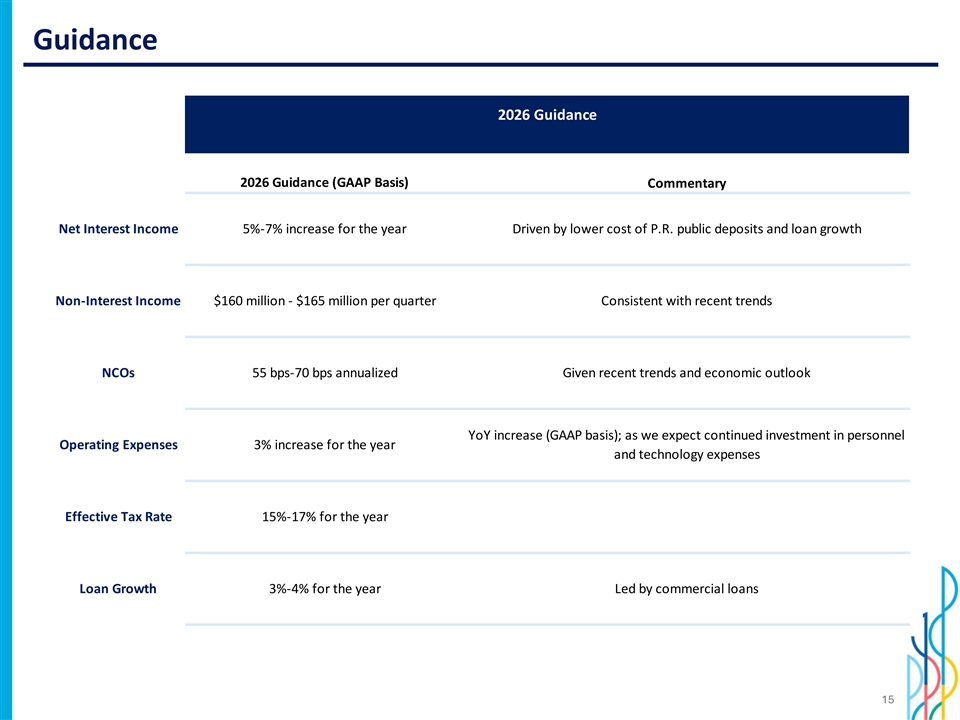 Guidance 2026 Guidance 2026 Guidance (GAAP Basis) Commentary Net Interest Income 5%-7% increase for the year Driven by lower cost of P.R. public deposits and loan growth Non-Interest Income $160 million - $165 million per quarter Consistent with recent trends NCOs 55 bps-70 bps annualized Given recent trends and economic outlook YoY increase (GAAP basis); as we expect continued investment in personnel Operating Expenses 3% increase for the year and technology expenses Effective Tax Rate 15%-17% for the year Loan Growth 3%-4% for the year Led by commercial loans 15