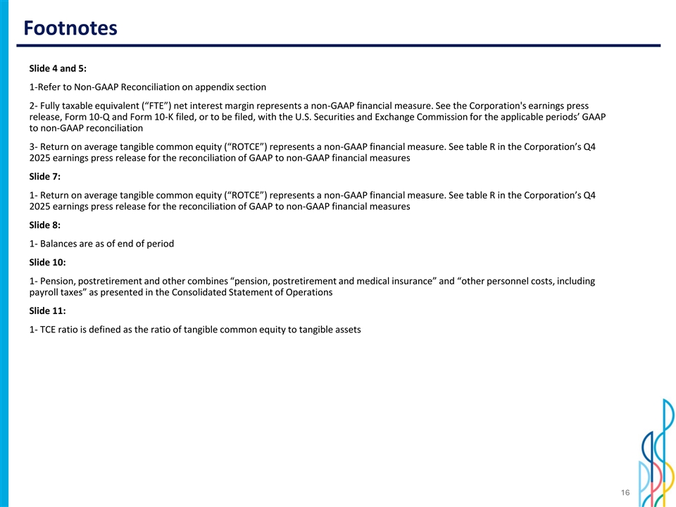 Footnotes Slide 4 and 5: 1-Refer to Non-GAAP Reconciliation on appendix section 2- Fully taxable equivalent (“FTE”) net interest margin represents a non-GAAP financial measure. See the Corporation's earnings press release, Form 10-Q and Form 10-K filed, or to be filed, with the U.S. Securities and Exchange Commission for the applicable periods’ GAAP to non-GAAP reconciliation 3- Return on average tangible common equity (“ROTCE”) represents a non-GAAP financial measure. See table R in the Corporation’s Q4 2025 earnings press release for the reconciliation of GAAP to non-GAAP financial measures Slide 7: 1- Return on average tangible common equity (“ROTCE”) represents a non-GAAP financial measure. See table R in the Corporation’s Q4 2025 earnings press release for the reconciliation of GAAP to non-GAAP financial measures Slide 8: 1- Balances are as of end of period Slide 10: 1- Pension, postretirement and other combines “pension, postretirement and medical insurance” and “other personnel costs, including payroll taxes” as presented in the Consolidated Statement of Operations Slide 11: 1- TCE ratio is defined as the ratio of tangible common equity to tangible assets 16