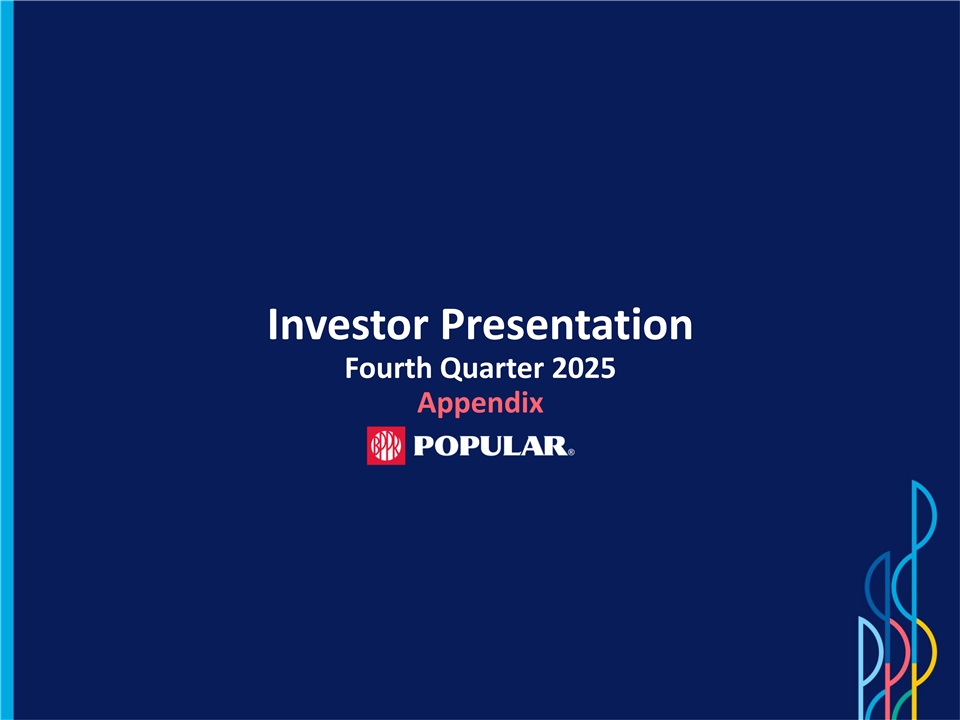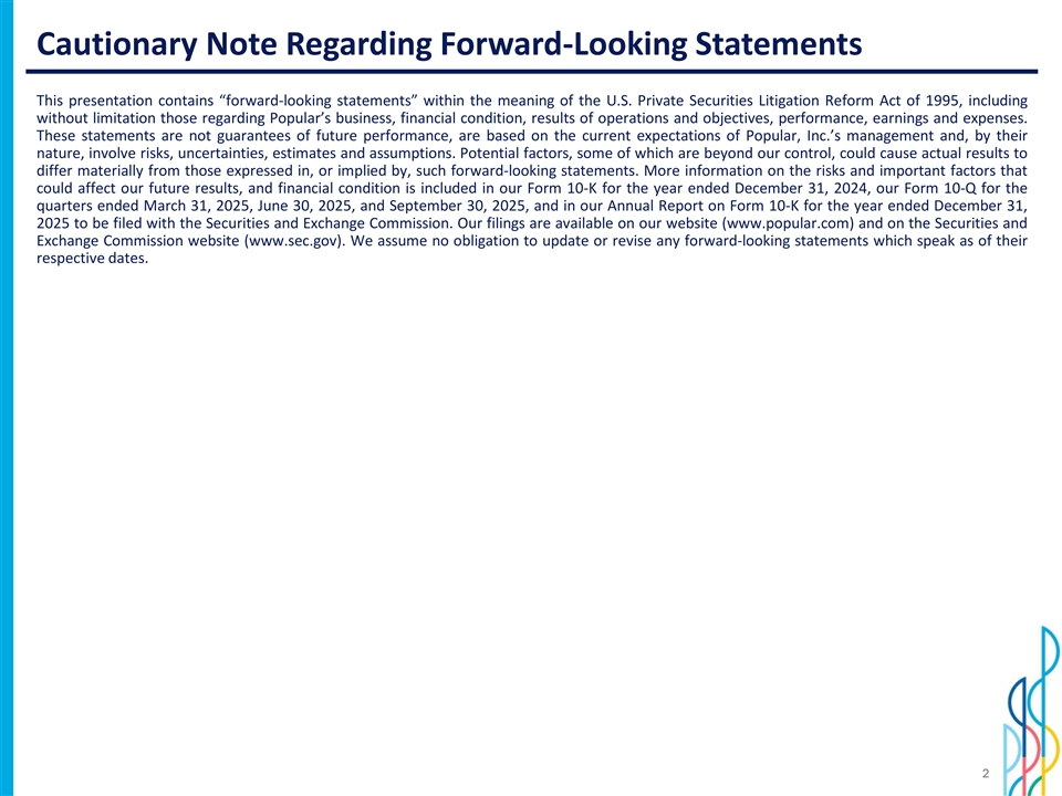 Cautionary Note Regarding Forward-Looking Statements This presentation contains “forward-looking statements” within the meaning of the U.S. Private Securities Litigation Reform Act of 1995, including without limitation those regarding Popular’s business, financial condition, results of operations and objectives, performance, earnings and expenses. These statements are not guarantees of future performance, are based on the current expectations of Popular, Inc.’s management and, by their nature, involve risks, uncertainties, estimates and assumptions. Potential factors, some of which are beyond our control, could cause actual results to differ materially from those expressed in, or implied by, such forward-looking statements. More information on the risks and important factors that could affect our future results, and financial condition is included in our Form 10-K for the year ended December 31, 2024, our Form 10-Q for the quarters ended March 31, 2025, June 30, 2025, and September 30, 2025, and in our Annual Report on Form 10-K for the year ended December 31, 2025 to be filed with the Securities and Exchange Commission. Our filings are available on our website (www.popular.com) and on the Securities and Exchange Commission website (www.sec.gov). We assume no obligation to update or revise any forward-looking statements which speak as of their respective dates. 2