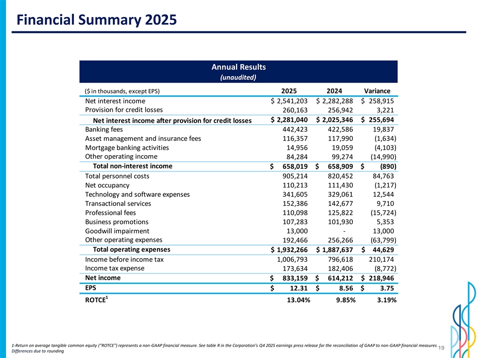 Financial Summary 2025 Annual Results (unaudited) ($ in thousands, except EPS) 2025 2024 Variance Net interest income $ 2,541,203 $ 2,282,288 $ 258,915 Provision for credit losses 260,163 256,942 3 ,221 $ 2,281,040 $ 2,025,346 $ 255,694 Net interest income after provision for credit losses Banking fees 4 42,423 4 22,586 19,837 Asset management and insurance fees 1 16,357 1 17,990 ( 1,634) Mortgage banking activities 14,956 19,059 ( 4,103) Other operating income 84,284 99,274 (14,990) Total non-interest income $ 6 58,019 $ 6 58,909 $ (890) Total personnel costs 905,214 820,452 84,763 Net occupancy 110,213 111,430 ( 1,217) Technology and software expenses 341,605 329,061 12,544 Transactional services 152,386 142,677 9,710 Professional fees 1 10,098 125,822 (15,724) Business promotions 1 07,283 101,930 5,353 Goodwill impairment 13,000 - 13,000 Other operating expenses 1 92,466 256,266 (63,799) Total operating expenses $ 1,932,266 $ 1,887,637 $ 44,629 Income before income tax 1,006,793 796,618 210,174 Income tax expense 173,634 182,406 (8,772) Net income $ 8 33,159 $ 6 14,212 $ 218,946 EPS $ 1 2.31 $ 8.56 $ 3 .75 1 ROTCE 13.04% 9.85% 3.19% 1-Return on average tangible common equity (“ROTCE”) represents a non-GAAP financial measure. See table R in the Corporation’s Q4 2025 earnings press release for the reconciliation of GAAP to non-GAAP financial measures 19 Differences due to rounding