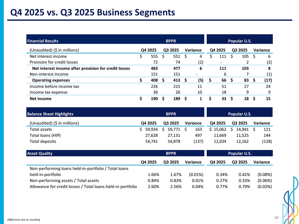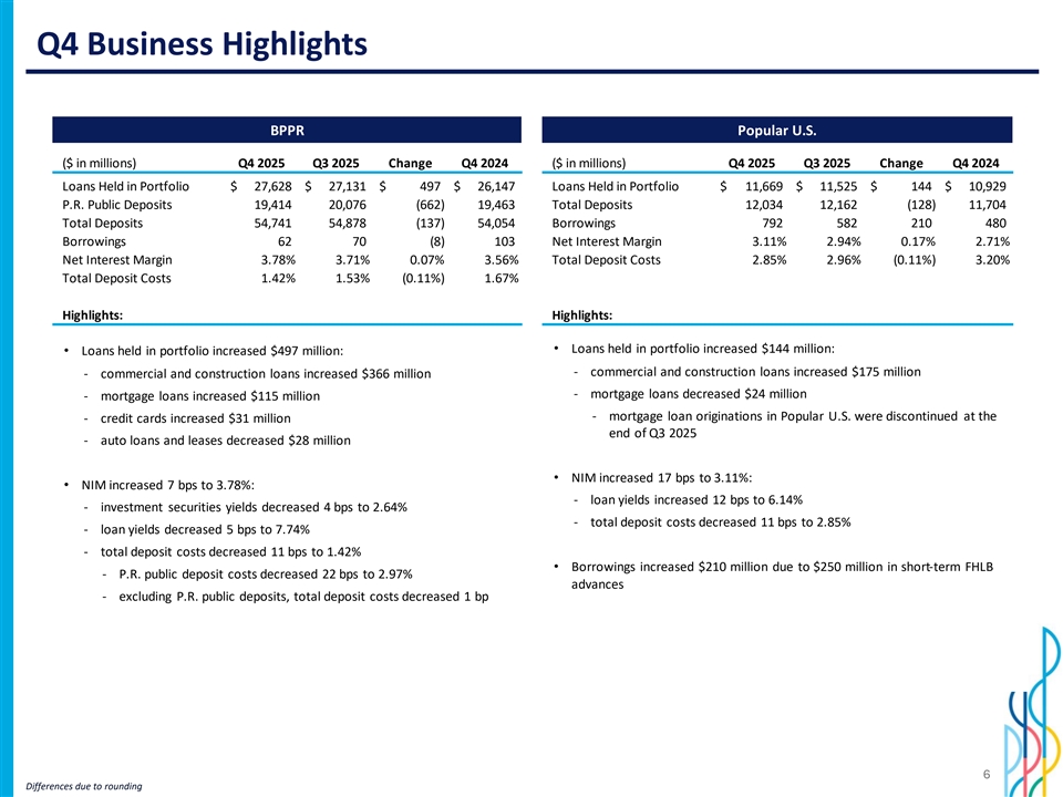 Q4 2025 Highlights Financial Highlights Quarter Highlights ($ in millions, except per share information) Income Statement Q4 2025 Q3 2025 Change Q4 2024 Highlights: Net Income $ 234 $ 211 $ 23 $ 178 • Net income increased $23 million to $234 million 1 Adjusted Net Income 224 211 13 178• Adjusted net income of $224 million excludes the impact of a partial Net Interest Margin (NIM) 3.61% 3.51% 0.10% 3.35% release of the FDIC special assessment reserve 2 Net Interest Margin FTE 4.03% 3.90% 0.13% 3.62% • Net interest income increased $11 million to $658 million Total Deposit Costs 1.68% 1.79% (0.11%) 1.96% • NIM of 3.61% increased 10 bps; FTE NIM expanded 13 bps to 4.03% EPS $ 3.53 $ 3.15 $ 0.38 $ 2 .51 • Loans held in portfolio grew $641 million or 1.7%, driven by commercial and construction loans at both banks and mortgage loans Financial Ratios in BPPR ROA 1.23% 1.09% 0.14% 0.97% • Total deposits decreased $323 million or 1.0%; excluding P.R. public 3 ROTCE 14.39% 13.06% 1.33% 11.22% deposits, customer deposits increased $339 million or 0.7% • Total deposit costs decreased 11 bps driven by a 22 bps reduction in Ending Balances P.R. public deposit costs Loans Held in Portfolio $ 3 9,328 $ 3 8,687 $ 641 $ 37,108 • NPLs decreased $4 million to $498 million; NPL ratio at 1.27% vs. Total Assets 75,348 75,066 282 73,045 1.30% in Q3 Total Deposits 66,190 66,513 ( 323) 64,884 • NCO Ratio of 0.51% vs. 0.60% in Q3 Borrowings 1,449 1,247 202 1,176 • Tangible book value per share increased $3.53 or 4.5% to $82.65 • ROTCE increased to 14.39% Credit Quality • Common Equity Tier 1 decreased 7 bps to 15.72% Non-Performing Loans (NPLs) $ 498 $ 502 $ (4) $ 351 NPL Ratio 1.27% 1.30% (0.03%) 0.95% NCO Ratio 0.51% 0.60% (0.09%) 0.74% Capital Actions ACL-NPL Ratio 162% 157% 5% 213% • Repurchased $148 million in common stock at an average price of $118.34 per share and increased quarterly common stock dividend Capital per share to $0.75, an increase from $0.70 Common Equity Tier 1 15.72% 15.79% (0.07%) 16.03% ⁻ $281 million remained under the active common stock Tangible Book Value Per Share $ 82.65 $ 7 9.12 $ 3.53 $ 68.16 repurchase authorization as of December 31, 2025 5 See Slide 16 for footnotes Differences due to rounding