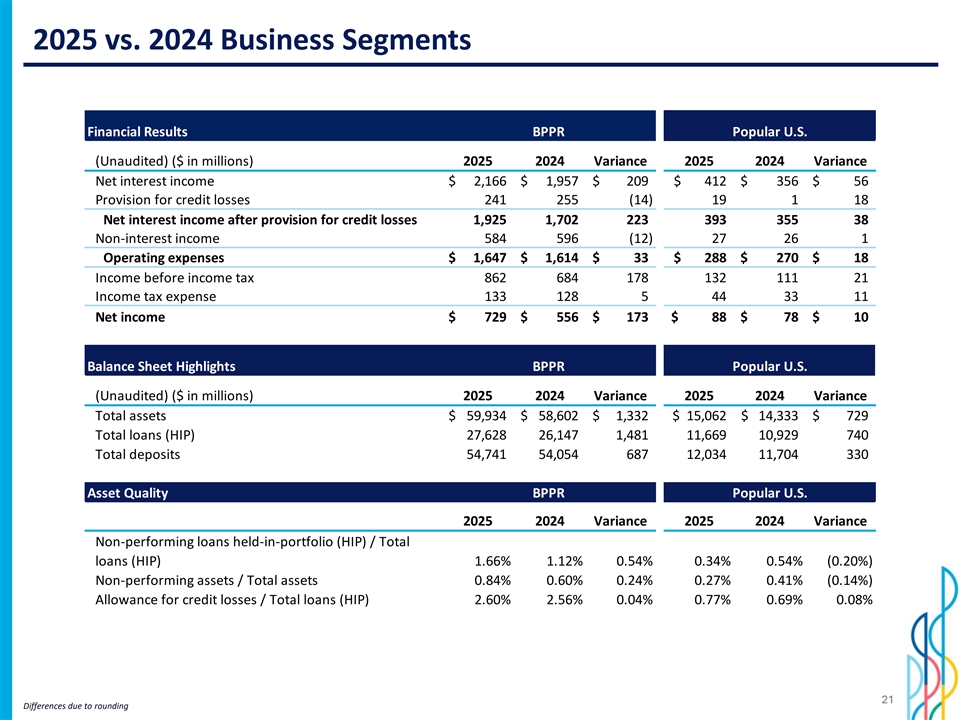 Q4 2025 vs. Q3 2025 Business Segments Financial Results BPPR Popular U.S. (Unaudited) ($ in millions) Q4 2025 Q3 2025 Variance Q4 2025 Q3 2025 Variance Net interest income $ 555 $ 551 $ 4 $ 111 $ 105 $ 6 Provision for credit losses 72 74 (2) - 2 (2) Net interest income after provision for credit losses 483 477 6 111 103 8 Non-interest income 151 151 - 6 7 (1) Operating expenses $ 408 $ 413 $ (5) $ 66 $ 83 $ (17) Income before income tax 226 215 11 51 27 24 Income tax expense 36 26 10 18 9 9 Net income $ 190 $ 189 $ 1 $ 33 $ 18 $ 15 Balance Sheet Highlights BPPR Popular U.S. (Unaudited) ($ in millions) Q4 2025 Q3 2025 Variance Q4 2025 Q3 2025 Variance Total assets $ 59,934 $ 59,771 $ 163 $ 1 5,062 $ 14,941 $ 121 Total loans (HIP) 27,628 27,131 497 11,669 11,525 144 Total deposits 54,741 54,878 (137) 1 2,034 12,162 (128) Asset Quality BPPR Popular U.S. Q4 2025 Q3 2025 Variance Q4 2025 Q3 2025 Variance Non-performing loans held-in-portfolio / Total loans held-in-portfolio 1.66% 1.67% (0.01%) 0.34% 0.42% (0.08%) Non-performing assets / Total assets 0.84% 0.83% 0.01% 0.27% 0.33% (0.06%) Allowance for credit losses / Total loans held-in-portfolio 2.60% 2.56% 0.04% 0.77% 0.79% (0.02%) 20 Differences due to rounding