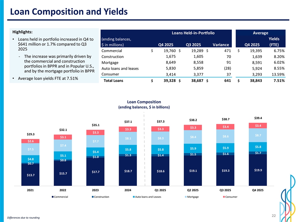 2025 vs. 2024 Business Segments Financial Results BPPR Popular U.S. (Unaudited) ($ in millions) 2025 2024 Variance 2025 2024 Variance Net interest income $ 2,166 $ 1,957 $ 209 $ 412 $ 356 $ 56 Provision for credit losses 241 255 (14) 19 1 18 Net interest income after provision for credit losses 1,925 1,702 223 393 355 38 Non-interest income 584 596 (12) 27 26 1 Operating expenses $ 1,647 $ 1,614 $ 33 $ 288 $ 270 $ 18 Income before income tax 862 684 178 132 111 21 Income tax expense 133 128 5 44 33 11 Net income $ 729 $ 556 $ 173 $ 88 $ 78 $ 10 Balance Sheet Highlights BPPR Popular U.S. (Unaudited) ($ in millions) 2025 2024 Variance 2025 2024 Variance Total assets $ 59,934 $ 58,602 $ 1,332 $ 15,062 $ 1 4,333 $ 729 Total loans (HIP) 27,628 26,147 1 ,481 11,669 1 0,929 740 Total deposits 54,741 54,054 687 1 2,034 1 1,704 330 Asset Quality BPPR Popular U.S. 2025 2024 Variance 2025 2024 Variance Non-performing loans held-in-portfolio (HIP) / Total loans (HIP) 1.66% 1.12% 0.54% 0.34% 0.54% (0.20%) Non-performing assets / Total assets 0.84% 0.60% 0.24% 0.27% 0.41% (0.14%) Allowance for credit losses / Total loans (HIP) 2.60% 2.56% 0.04% 0.77% 0.69% 0.08% 21 Differences due to rounding