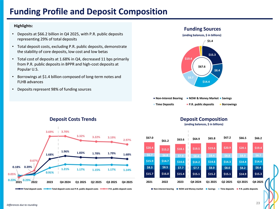 Loan Composition and Yields Highlights: Loans Held-in-Portfolio Average Yields • Loans held in portfolio increased in Q4 to (ending balances, $641 million or 1.7% compared to Q3 $ in millions) Q4 2025 Q3 2025 Variance Q4 2025 (FTE) 2025 $ $ $ $ Commercial 19,760 19,289 471 19,395 6.75% ‐ The increase was primarily driven by Construction 1,675 1,605 70 1,639 8.20% the commercial and construction 8,649 8,558 91 6.02% Mortgage 8,591 portfolios in BPPR and in Popular U.S., 5,830 5,859 (28) 8.55% Auto loans and leases 5,924 and by the mortgage portfolio in BPPR Consumer 3,414 3,377 37 3,293 13.59% • Average loan yields FTE at 7.51% Total Loans $ 39,328 $ 38,687 $ 641 $ 38,843 7.51% Loan Composition (ending balances, $ in billions) 45.0 0 $39.4 $38.7 $38.2 40.0 0 $37.3 $37.1 $35.1 $3.4 $3.4 $3.3 35.0 0 $3.3 $3.3 $32.1 $3.3 $29.3 $8.7 $8.6 30.0 0 $3.1 $8.4 $8.1 $8.3 $2.6 $7.7 25.0 0 $7.4 $5.8 $5.9 $5.9 $7.5 $5.8 $5.8 $5.4 20.0 0 $1.7 $1.6 $1.5 $1.3 $1.4 $5.1 $1.0 $4.8 $0.8 15.0 0 $0.7 10.0 0 $19.9 $19.1 $19.3 $18.7 $18.6 $17.7 $15.7 $13.7 5.00 - 2021 2022 2023 2024 Q1 2025 Q2 2025 Q3 2025 Q4 2025 Commercial Construction Auto loans and Leases Mortgage Consumer 22 Differences due to rounding