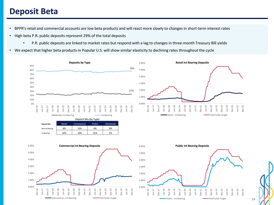 Funding Profile and Deposit Composition Highlights: Funding Sources • Deposits at $66.2 billion in Q4 2025, with P.R. public deposits (ending balances, $ in billions) representing 29% of total deposits $1.4 • Total deposit costs, excluding P.R. public deposits, demonstrate the stability of core deposits, low cost and low betas $15.3 $19.4 • Total cost of deposits at 1.68% in Q4, decreased 11 bps primarily from P.R. public deposits in BPPR and high-cost deposits at $67.6 Popular U.S. $8.4 • Borrowings at $1.4 billion composed of long-term notes and $8.7 $14.4 FLHB advances • Deposits represent 98% of funding sources Non-Interest Bearing NOW & Money Market Savings Time Deposits P.R. public deposits Borrowings Deposit Costs Trends Deposit Composition (ending balances, $ in billions) 0.045 3.69% 3.70% 0.04 80.0 0 3.32% 3.22% 0.035 3.19% $67.2 $67.0 $66.5 $65.8 $66.2 $64.9 $63.6 2.97% 70.0 0 $61.2 0.03 60.0 0 $20.4 $20.9 $20.1 $19.4 $19.6 0.025 $18.1 $19.5 $15.2 50.0 0 1.96% 1.83% 1.78% 1.79% 0.02 1.68% 1.68% $6.7 $6.8 $8.7 40.0 0 $7.9 $8.4 $8.8 $8.9 $8.4 0.015 0.67% 30.0 0 $15.9 $14.7 $14.4 $14.6 $14.2 $14.6 $14.3 $14.4 0.01 20.0 0 0.18% 0.39% $8.3 $8.5 $7.7 $7.7 $8.0 $8.0 $8.2 $8.4 1.21% 1.17% 1.15% 1.17% 1.14% 0.005 10.0 0 0.91% $15.7 $16.0 $15.4 $15.1 $15.2 $15.1 $14.9 $15.3 0.05% - 0 0.23% 0.29% 2021 2022 2023 Q4 2024 Q1 2025 Q2 2025 Q3 2025 Q4 2025 2021 2022 2023 Q4 2024 Q1 2025 Q2 2025 Q3 2025 Q4 2025 Total deposit costs Total deposit costs excl P.R. public deposit costs P.R. public deposit costs Non-interest bearing NOW and Money market Savings Time deposits P.R. public deposits 23 Differences due to rounding