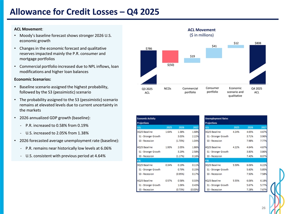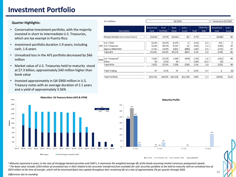 Investment Portfolio Quarter Highlights: • Conservative investment portfolio, with the majority invested in short to intermediate U.S. Treasuries, which are tax exempt in Puerto Rico • Investment portfolio duration 1.9 years; including cash, 1.6 years • Unrealized loss in the AFS portfolio decreased by $66 million • Market value of U.S. Treasuries held to maturity stood at $7.3 billion, approximately $40 million higher than book value • Invested approximately in Q4 $900 million in U.S. Treasury notes with an average duration of 2.1 years and a yield of approximately 3.56% Maturities: US Treasury Notes (AFS & HTM) 2,000 Maturity Profile 1,800 35% 32% Yield 1,600 Legacy New 30% 1.29% 3.84% 1,400 26% 25% 24% 1,200 1,000 20% 800 15% 600 11% 10% 400 5% 4% 200 2% 0% 0% 0% 0% 0% 0% 0% 0% 0% 0% 0% 0% 0% 0% - 0% Dec-25 Mar-26 Jun-26 Sep-26 Dec-26 Mar-27 Jun-27 Sep-27 Dec-27 Mar-28 Jun-28 Sep-28 Dec-28 Mar-29 Jun-29 Sep-29 0 - 3 yrs 4 - 5 yrs 6 - 7 yrs 8 - 10 yrs UST Legacy UST New (Program restarted in 2024) U.S. T-bills U.S. Treasuries - AFS U.S. Treasuries - HTM Agency MBS/CMO 1 Maturity expressed in years; In the case of mortgage-backed securities and CMO’s, it represents the weighted average life of the bonds assuming market consensus prepayment speeds 2 The Book value includes $293 million of unrealized loss in AOCI related to the securities transferred from available-for-sale securities portfolio to the held-to-maturity with an unrealized loss of $873 million at the time of transfer, which will be amortized (back into capital) throughout their remaining life at a rate of approximately 5% per quarter through 2026. 25 Differences due to rounding $ Millions