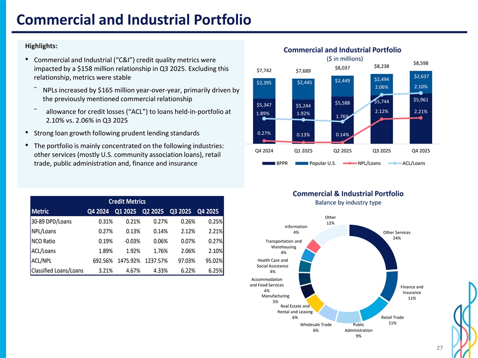 Commercial and Industrial Portfolio Highlights: Commercial and Industrial Portfolio ($ in millions) • Commercial and Industrial (“C&I”) credit quality metrics were $8,598 $8,238 $8,037 impacted by a $158 million relationship in Q3 2025. Excluding this 6.2% $7,742 $7,689 8,000 $2,637 relationship, metrics were stable $2,494 $2,449 $2,395 $2,445 7,000 2.10% 2.06% ⁻ NPLs increased by $165 million year-over-year, primarily driven by 6,000 the previously mentioned commercial relationship $5,961 5,000 $5,744 $5,588 $5,347 $5,244 3.1% 4,000 2.12% 2.21% ⁻ allowance for credit losses (“ACL”) to loans held-in-portfolio at 1.89% 1.92% 1.76% 3,000 2.10% vs. 2.06% in Q3 2025 2,000 0.27% • Strong loan growth following prudent lending standards 1,000 0.13% 0.14% 0 0.0% • The portfolio is mainly concentrated on the following industries: Q4 2024 Q1 2025 Q2 2025 Q3 2025 Q4 2025 other services (mostly U.S. community association loans), retail BPPR Popular U.S. NPL/Loans ACL/Loans trade, public administration and, finance and insurance Commercial & Industrial Portfolio Credit Metrics Balance by industry type Metric Q4 2024 Q1 2025 Q2 2025 Q3 2025 Q4 2025 Other 30-89 DPD/Loans 0.31% 0.21% 0.27% 0.26% 0.25% 12% Information NPL/Loans 0.27% 0.13% 0.14% 2.12% 2.21% 4% Other Services 24% Transportation and NCO Ratio 0.19% -0.03% 0.06% 0.07% 0.27% Warehousing ACL/Loans 1.89% 1.92% 1.76% 2.06% 2.10% 4% Health Care and ACL/NPL 692.56% 1475.92% 1237.57% 97.03% 95.02% Social Assistance Classified Loans/Loans 3.21% 4.67% 4.33% 6.22% 6.25% 4% Accommodation and Food Services Finance and 4% Insurance Manufacturing 11% 5% Real Estate and Rental and Leasing 6% Retail Trade 11% Wholesale Trade Public 6% Administration 9% 27
