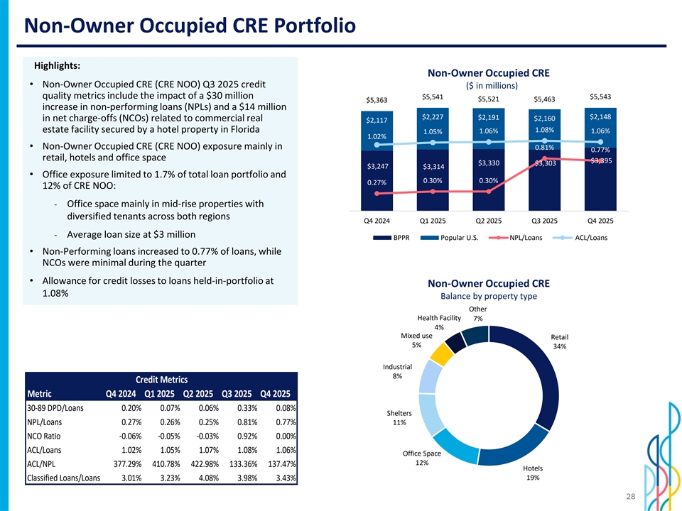 Non-Owner Occupied CRE Portfolio Highlights: Non-Owner Occupied CRE • Non-Owner Occupied CRE (CRE NOO) Q3 2025 credit ($ in millions) quality metrics include the impact of a $30 million $5,541 $5,543 $5,521 $5,363 $5,463 increase in non-performing loans (NPLs) and a $14 million 5,000 $2,227 $2,148 $2,191 in net charge-offs (NCOs) related to commercial real $2,160 $2,117 estate facility secured by a hotel property in Florida 1.08% 1.06% 1.06% 1.05% 4,000 1.02% • Non-Owner Occupied CRE (CRE NOO) exposure mainly in 0.81% 0.77% 3,000 retail, hotels and office space $3,395 $3,330 $3,303 $3,247 $3,314 2,000 • Office exposure limited to 1.7% of total loan portfolio and 0.30% 0.30% 0.27% 12% of CRE NOO: 1,000 ‐ Office space mainly in mid-rise properties with 0 0.0% diversified tenants across both regions Q4 2024 Q1 2025 Q2 2025 Q3 2025 Q4 2025 ‐ Average loan size at $3 million BPPR Popular U.S. NPL/Loans ACL/Loans • Non-Performing loans increased to 0.77% of loans, while NCOs were minimal during the quarter • Allowance for credit losses to loans held-in-portfolio at Non-Owner Occupied CRE 1.08% Balance by property type Other Health Facility 7% 4% Mixed use Retail 5% 34% Industrial 8% Credit Metrics Metric Q4 2024 Q1 2025 Q2 2025 Q3 2025 Q4 2025 30-89 DPD/Loans 0.20% 0.07% 0.06% 0.33% 0.08% Shelters NPL/Loans 0.27% 0.26% 0.25% 0.81% 0.77% 11% NCO Ratio -0.06% -0.05% -0.03% 0.92% 0.00% ACL/Loans 1.02% 1.05% 1.07% 1.08% 1.06% Office Space 12% ACL/NPL 377.29% 410.78% 422.98% 133.36% 137.47% Hotels 19% Classified Loans/Loans 3.01% 3.23% 4.08% 3.98% 3.43% 28