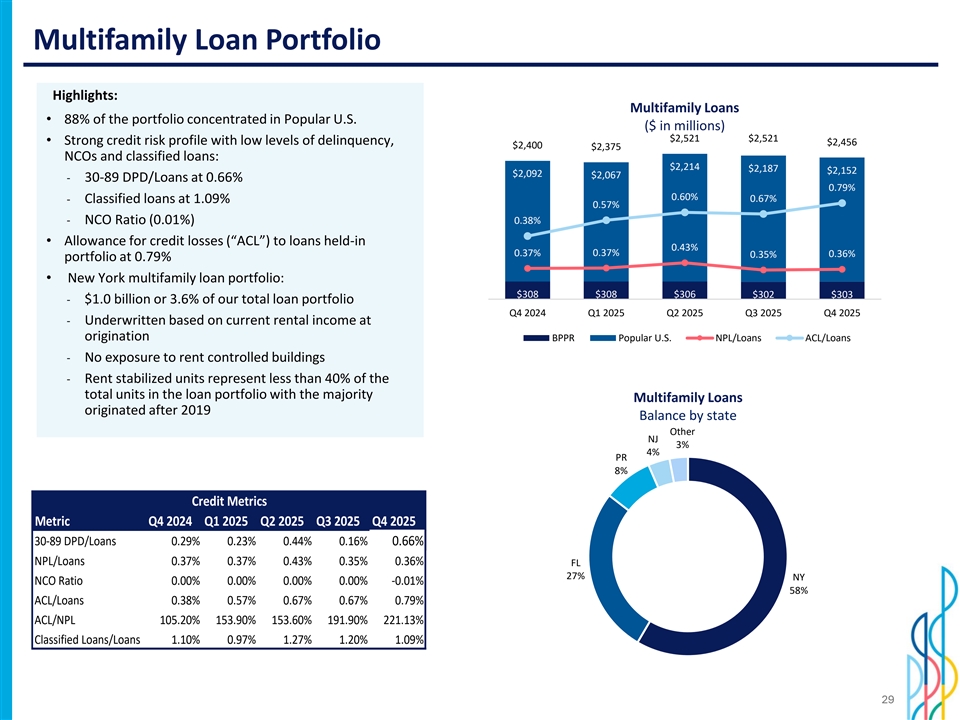 Multifamily Loan Portfolio Highlights: Multifamily Loans • 88% of the portfolio concentrated in Popular U.S. ($ in millions) $2,521 $2,521 • Strong credit risk profile with low levels of delinquency, $2,456 $2,400 $2,375 2,500 NCOs and classified loans: 1.6% $2,214 $2,187 $2,152 $2,092 $2,067 ‐ 30-89 DPD/Loans at 0.66% 1.4% 2,000 0.79% 1.2% 0.60% ‐ Classified loans at 1.09% 0.67% 0.57% 1,500 1.0% ‐ NCO Ratio (0.01%) 0.38% 0.8% 1,000 • Allowance for credit losses (“ACL”) to loans held-in 0.6% 0.43% 0.37% 0.37% 0.36% 0.35% portfolio at 0.79% 0.4% 500 • New York multifamily loan portfolio: 0.2% $308 $308 $306 $302 $303 0 0.0% ‐ $1.0 billion or 3.6% of our total loan portfolio Q4 2024 Q1 2025 Q2 2025 Q3 2025 Q4 2025 ‐ Underwritten based on current rental income at origination BPPR Popular U.S. NPL/Loans ACL/Loans ‐ No exposure to rent controlled buildings ‐ Rent stabilized units represent less than 40% of the total units in the loan portfolio with the majority Multifamily Loans originated after 2019 Balance by state Other NJ 3% 4% PR 8% Credit Metrics Metric Q4 2024 Q1 2025 Q2 2025 Q3 2025 Q4 2025 30-89 DPD/Loans 0.29% 0.23% 0.44% 0.16% 0.66% NPL/Loans 0.37% 0.37% 0.43% 0.35% 0.36% FL 27% NY NCO Ratio 0.00% 0.00% 0.00% 0.00% -0.01% 58% ACL/Loans 0.38% 0.57% 0.67% 0.67% 0.79% ACL/NPL 105.20% 153.90% 153.60% 191.90% 221.13% Classified Loans/Loans 1.10% 0.97% 1.27% 1.20% 1.09% 29