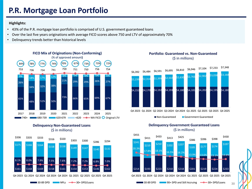 P.R. Mortgage Loan Portfolio Highlights: • 43% of the P.R. mortgage loan portfolio is comprised of U.S. government guaranteed loans • Over the last five years originations with average FICO scores above 750 and LTV of approximately 70% • Delinquency trends better than historical levels FICO Mix of Originations (Non-Conforming) Portfolio: Guaranteed vs. Non-Guaranteed (% of approved amount) ($ in millions) 70% 67% 73% 72% 84% 78% 77% 74% 73% 8,00 0 $7,348 0.23 0 0. .2 23 2 $7,233 0 0. .2 22 1 $7,104 0 0. .2 20 1 0 0. .2 10 9 759 756 0 0. .1 18 9 753 751 750 754 $6,946 0 0. .1 17 8 741 0 0. .1 17 6 736 734 $6,810 0 0. .1 15 6 $6,695 0 0. .1 14 5 0.14 $6,591 0 0. .1 13 3 $6,484 0 0. .1 12 2 $6,392 0 0. .1 11 1 7,00 0 0 0. .1 10 0 0 0. .0 09 9 0 0. .0 08 8 0 0. .0 07 7 0 0. .0 06 6 0 0. .0 05 5 0 0. .0 04 4 $3,168 0 0. .0 03 3 0 0. .0 02 2 $3,038 0 0. .0 01 1 6% 5% 6% 5% 6% - (0.01) $2,902 ( (0 0. .0 02 1) ) 9% ( (0 0. .0 02 3) ) 12% $2,765 ( (0 0. .0 04 3) ) 6,00 0 ( (0 0. .0 05 4) ) $2,630 ( (0 0. .0 05 6) ) 18% 17% $2,502 ( (0 0. .0 07 6) ) ( (0 0. .0 07 8) ) $2,399 ( (0 0. .0 08 9) ) $2,314 ( (0 0. .1 00 9) ) ( (0 0. .1 11 0) ) $2,239 ( (0 0. .1 12 1) ) ( (0 0. .1 12 3) ) ( (0 0. .1 14 3) ) 21% ( (0 0. .1 14 5) ) 26% ( (0 0. .1 15 6) ) ( (0 0. .1 16 7) ) 29% 27% ( (0 0. .1 18 7) ) 29% 5,00 0 ( (0 0. .1 19 8) ) 26% ( (0 0. .2 19 0) ) ( (0 0. .2 21 0) ) ( (0 0. .2 21 2) ) ( (0 0. .2 22 3) ) ( (0 0. .2 24 3) ) ( (0 0. .2 24 5) ) ( (0 0. .2 26 5) ) ( (0 0. .2 27 6) ) ( (0 0. .2 28 7) ) 38% ( (0 0. .2 29 8) ) ( (0 0. .3 20 9) ) ( (0 0. .3 30 1) ) 32% ( (0 0. .3 31 2) ) 4,00 0 ( (0 0. .3 32 3) ) 34% ( (0 0. .3 33 4) ) ( (0 0. .3 34 5) ) ( (0 0. .3 36 5) ) ( (0 0. .3 36 7) ) ( (0 0. .3 38 7) ) ( (0 0. .3 39 8) ) ( (0 0. .4 39 0) ) ( (0 0. .4 41 0) ) $4,192 $4,193 $4,180 $4,181 $4,202 $4,195 $4,180 (0.41) $4,152 $4,170 ( (0 0. .4 42 2) ) ( (0 0. .4 43 3) ) ( (0 0. .4 44 4) ) ( (0 0. .4 45 5) ) 3,00 0 ( (0 0. .4 46 6) ) ( (0 0. .4 47 7) ) ( (0 0. .4 48 8) ) ( (0 0. .4 49 9) ) ( (0 0. .5 50 0) ) ( (0 0. .5 51 1) ) ( (0 0. .5 52 2) ) ( (0 0. .5 53 3) ) ( (0 0. .5 54 4) ) ( (0 0. .5 55 5) ) ( (0 0. .5 56 6) ) ( (0 0. .5 57 7) ) ( (0 0. .5 58 8) ) ( (0 0. .5 59 9) ) 2,00 0 ( (0 0. .6 60 0) ) 73% ( (0 0. .6 61 1) ) ( (0 0. .6 62 2) ) 69% ( (0 0. .6 63 3) ) 67% ( (0 0. .6 64 4) ) 65% 66% 65% ( (0 0. .6 65 5) ) ( (0 0. .6 66 6) ) ( (0 0. .6 67 7) ) ( (0 0. .6 68 8) ) ( (0 0. .6 69 9) ) ( (0 0. .7 70 0) ) ( (0 0. .7 71 1) ) 51% ( (0 0. .7 72 2) ) 50% ( (0 0. .7 73 3) ) 48% 1,00 0 ( (0 0. .7 74 4) ) ( (0 0. .7 75 5) ) ( (0 0. .7 76 6) ) ( (0 0. .7 77 7) ) ( (0 0. .7 78 8) ) ( (0 0. .7 79 9) ) ( (0 0. .8 80 0) ) ( (0 0. .8 81 1) ) ( (0 0. .8 82 2) ) ( (0 0. .8 83 3) ) ( (0 0. .8 84 4) ) ( (0 0. .8 85 5) ) ( (0 0. .8 86 6) ) ( (0 0. .8 87 7) ) - (0.88) Q4 2023 Q1 2024 Q2 2024 Q3 2024 Q4 2024 Q1 2025 Q2 2025 Q3 2025 Q4 2025 2017 2018 2019 2020 2021 2022 2023 2024 2025 Non-Guaranteed Government Guaranteed 740+ 680-739 620-679 <620 WA FICO Original LTV Delinquency Government Guaranteed Loans Delinquency Non-Guaranteed Loans ($ in millions) ($ in millions) 400 0.38 500 $455 0.380 0.38 0.375 0.37 0.370 0.37 0.365 $433 $430 0.36 $425 0.360 $336 0.36 0.355 $335 $333 0.35 0.350 $411 $413 0.35 0.345 0.34 450 0.340 $316 $320 0.34 $396 $398 0.335 350 0.33 $386 0.330 0.33 0.325 $303 $300 0.32 0.320 $294 0.32 0.315 0.31 0.310 $286 0.31 400 $241 0.305 0.30 0.300 0.30 0.295 0.29 0.290 300 0.29 $210 0.285 $197 $175 0.28 $207 0.280 $166 $164 0.28 0.275 0.27 $219 $202 0.270 350 0.27 0.265 $158 0.26 $174 0.260 $158 0.26 $177 0.255 0.25 $185 0.250 $149 0.25 0.245 $147 0.24 0.240 250 20.3% $132 0.24 0.235 0.23 0.230 $140 300 0.23 0.225 0.22 0.220 0.22 18.1% 0.215 17.8% 0.21 0.210 0.21 0.205 0.20 0.200 16.5% 16.2% 0.20 0.195 200 0.19 250 0.190 0.19 0.185 0.18 0.180 0.18 0.175 13.9% 13.6% 0.17 13.6% 0.170 0.17 13.1% 0.165 0.16 0.160 0.16 0.155 0.15 200 0.150 150 0.15 0.145 0.14 0.140 0.14 0.135 0.13 0.130 0.13 0.125 0.12 0.120 8.1% 8.0% 7.9% 0.12 150 0.115 7.5% 7.6% 0.11 0.110 7.2% 7.2% 7.0% 0.11 0.105 6.8% 0.10 0.100 100 0.10 0.095 0.09 0.090 0.09 0.085 0.08 0.080 100 0.08 0.075 0.07 0.070 0.07 0.065 0.06 0.060 0.06 0.055 50 0.05 0.050 0.05 0.045 0.04 0.040 50 0.04 0.035 0.03 0.030 $161 $168 $169 $158 $161 $154 $153 $146 $162 0.03 $214 $193 $223 $210 $218 $201 $219 $224 $233 0.025 0.02 0.020 0.02 0.015 0.01 0.010 0.01 0.005 0 - 0 - Q4 2023 Q1 2024 Q2 2024 Q3 2024 Q4 2024 Q1 2025 Q2 2025 Q3 2025 Q4 2025 Q4 2023 Q1 2024 Q2 2024 Q3 2024 Q4 2024 Q1 2025 Q2 2025 Q3 2025 Q4 2025 30-89 DPD NPLs 30+ DPD/Loans 30-89 DPD 90+ DPD and Still Accruing 30+ DPD/Loans 30