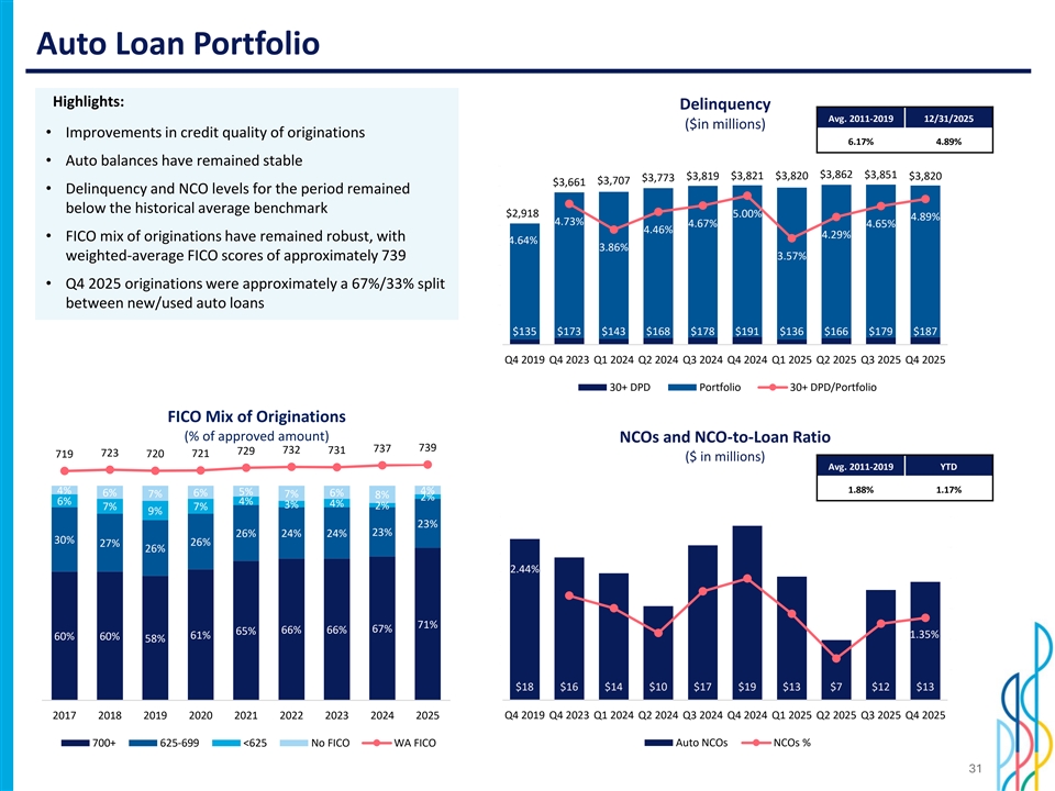 Auto Loan Portfolio Highlights: Delinquency Avg. 2011-2019 12/31/2025 ($in millions) • Improvements in credit quality of originations 6.17% 4.89% • Auto balances have remained stable 4500 0.06 $3,862 $3,851 $3,819 $3,821 $3,820 $3,820 $3,773 $3,707 4000 $3,661 • Delinquency and NCO levels for the period remained 0.05 3500 below the historical average benchmark $2,918 5.00% 4.89% 4.73% 3000 4.67% 4.65% 0.04 4.46% 4.29% • FICO mix of originations have remained robust, with 4.64% 2500 3.86% 0.03 3.57% weighted-average FICO scores of approximately 739 2000 1500 0.02 • Q4 2025 originations were approximately a 67%/33% split 1000 between new/used auto loans 0.01 500 $135 $173 $143 $168 $178 $191 $136 $166 $179 $187 0 0 Q4 2019 Q4 2023 Q1 2024 Q2 2024 Q3 2024 Q4 2024 Q1 2025 Q2 2025 Q3 2025 Q4 2025 30+ DPD Portfolio 30+ DPD/Portfolio FICO Mix of Originations (% of approved amount) NCOs and NCO-to-Loan Ratio 739 737 729 732 731 723 720 721 719 ($ in millions) Avg. 2011-2019 YTD 700 100% 1.88% 1.17% 4% 5% 4% 6% 6% 6% 7% 7% 8% 2% 6% 4% 4% 3% 2% 600 7% 7% 9% 20 0.03 23% 80% 23% 18 26% 24% 24% 500 30% 27% 26% 0.025 26% 16 60% 14 2.44% 400 0.02 12 300 10 0.015 40% 71% 8 67% 65% 66% 66% 200 61% 1.35% 60% 60% 0.01 58% 6 20% 4 100 0.005 2 $18 $16 $14 $10 $17 $19 $13 $7 $12 $13 0% 0 0 0 2017 2018 2019 2020 2021 2022 2023 2024 2025 Q4 2019 Q4 2023 Q1 2024 Q2 2024 Q3 2024 Q4 2024 Q1 2025 Q2 2025 Q3 2025 Q4 2025 700+ 625-699 <625 No FICO WA FICO Auto NCOs NCOs % 31