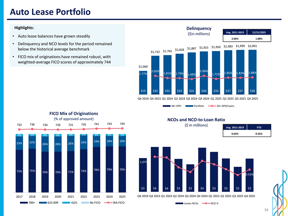 Auto Lease Portfolio Highlights: Delinquency Avg. 2011-2019 12/31/2025 ($in millions) • Auto lease balances have grown steadily 2.06% 1.88% 2500 0.06 • Delinquency and NCO levels for the period remained $1,999 $2,001 $1,983 $1,950 $1,925 0.05 $1,887 below the historical average benchmark 2000 $1,828 $1,765 $1,732 0.04 • FICO mix of originations have remained robust, with 1500 weighted-average FICO scores of approximately 744 0.03 $1,060 2.06% 2.05% 1000 1.85% 1.88% 1.81% 1.79% 1.83% 1.77% 1.71% 1.69% 0.02 500 0.01 $19 $35 $32 $33 $32 $40 $33 $37 $37 $38 0 0 Q4 2019 Q4 2023 Q1 2024 Q2 2024 Q3 2024 Q4 2024 Q1 2025 Q2 2025 Q3 2025 Q4 2025 30+ DPD Portfolio 30+ DPD/Loans FICO Mix of Originations (% of approved amount) NCOs and NCO-to-Loan Ratio 743 744 741 736 735 732 730 730 731 ($ in millions) Avg. 2011-2019 YTD 700 100% 0.65% 0.55% 2% 3% 3% 3% 3% 3% 4% 4% 4% 600 19% 18% 18% 4 0.012 22% 24% 23% 26% 26% 26% 80% 3.5 500 0.01 3 60% 400 0.008 2.5 1.07% 300 2 0.006 40% 78% 79% 79% 75% 74% 73% 71% 70% 70% 1.5 200 0.55% 0.004 1 20% 0.002 100 0.5 $3 $4 $3 $2 $4 $3 $3 $2 $3 $4 0 0 0% 0 Q4 2019 Q4 2023 Q1 2024 Q2 2024 Q3 2024 Q4 2024 Q1 2025 Q2 2025 Q3 2025 Q4 2025 2017 2018 2019 2020 2021 2022 2023 2024 2025 700+ 625-699 <625 No FICO WA FICO Leases NCOs NCO % 32